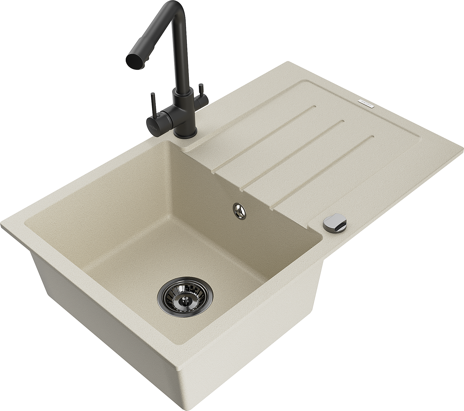 Mexen Bruno žulový kuchynský drez s 1 komorou, odkvapkávačom a kuchynskou batériou Duero, béžová - 6513-69-671600-70