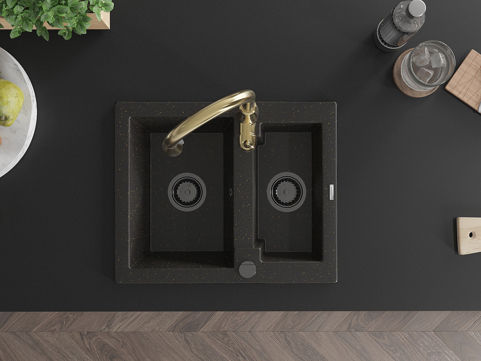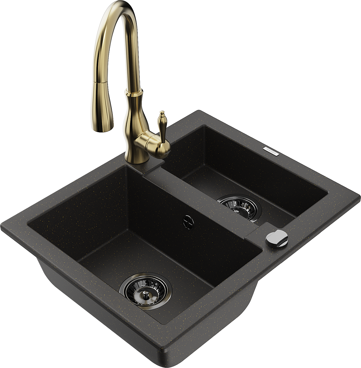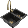 Mexen Carlos žulový kuchynský drez 1,5-komorový s kuchynskou batériou Savita, čierny/zlatý metalický - 6518-75-672601-50-B