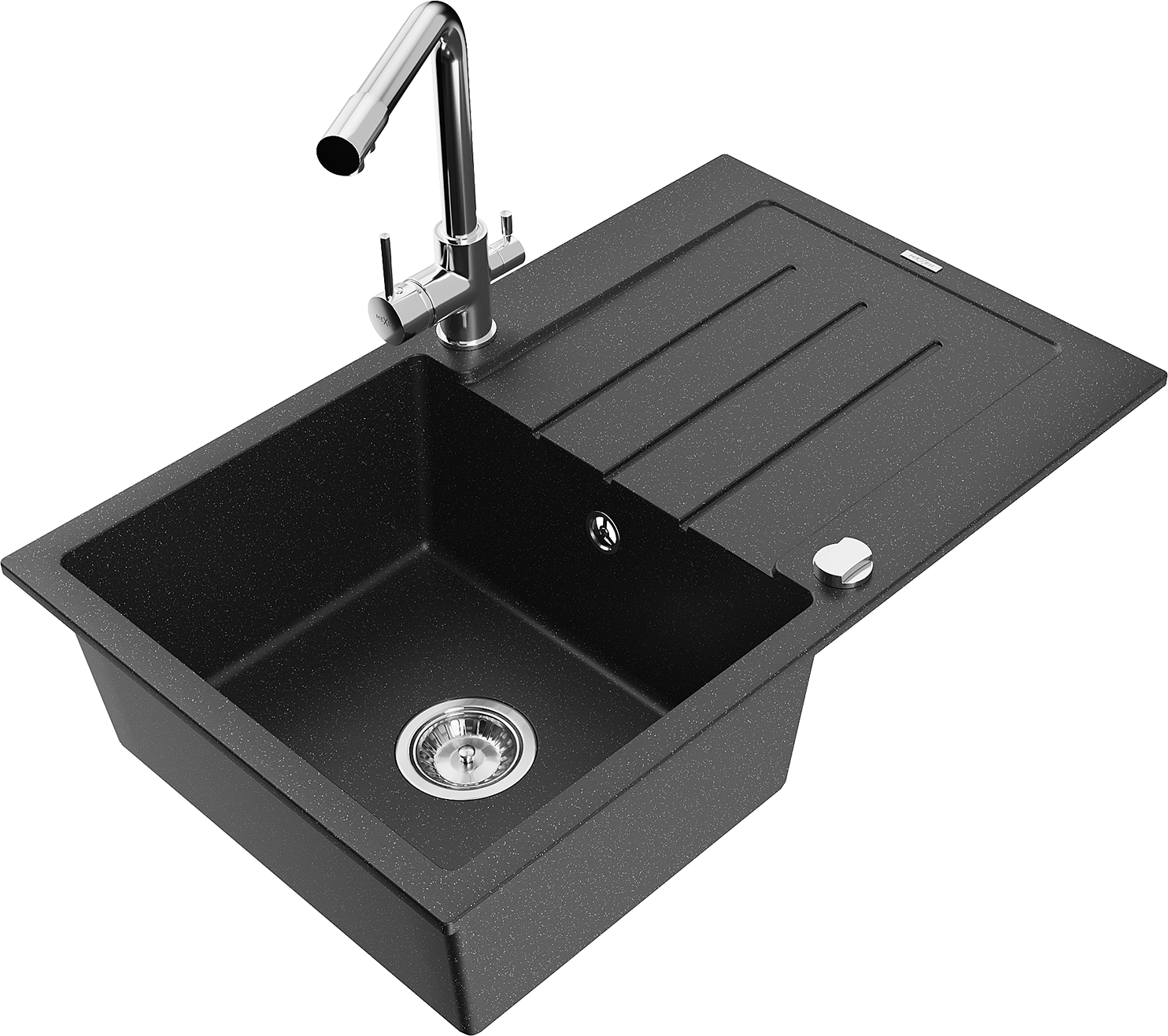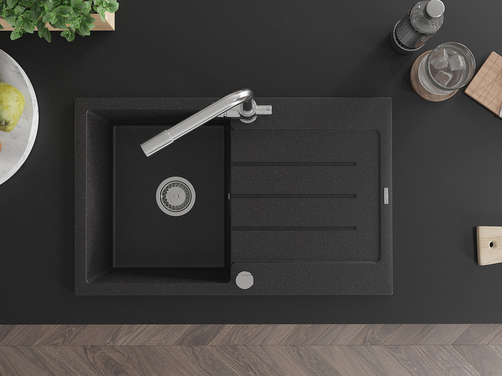 Mexen Bruno granitový drez s jednou komorou a odkvapkávačom s kuchynskou batériou Duero, čierny/strieborný metalický