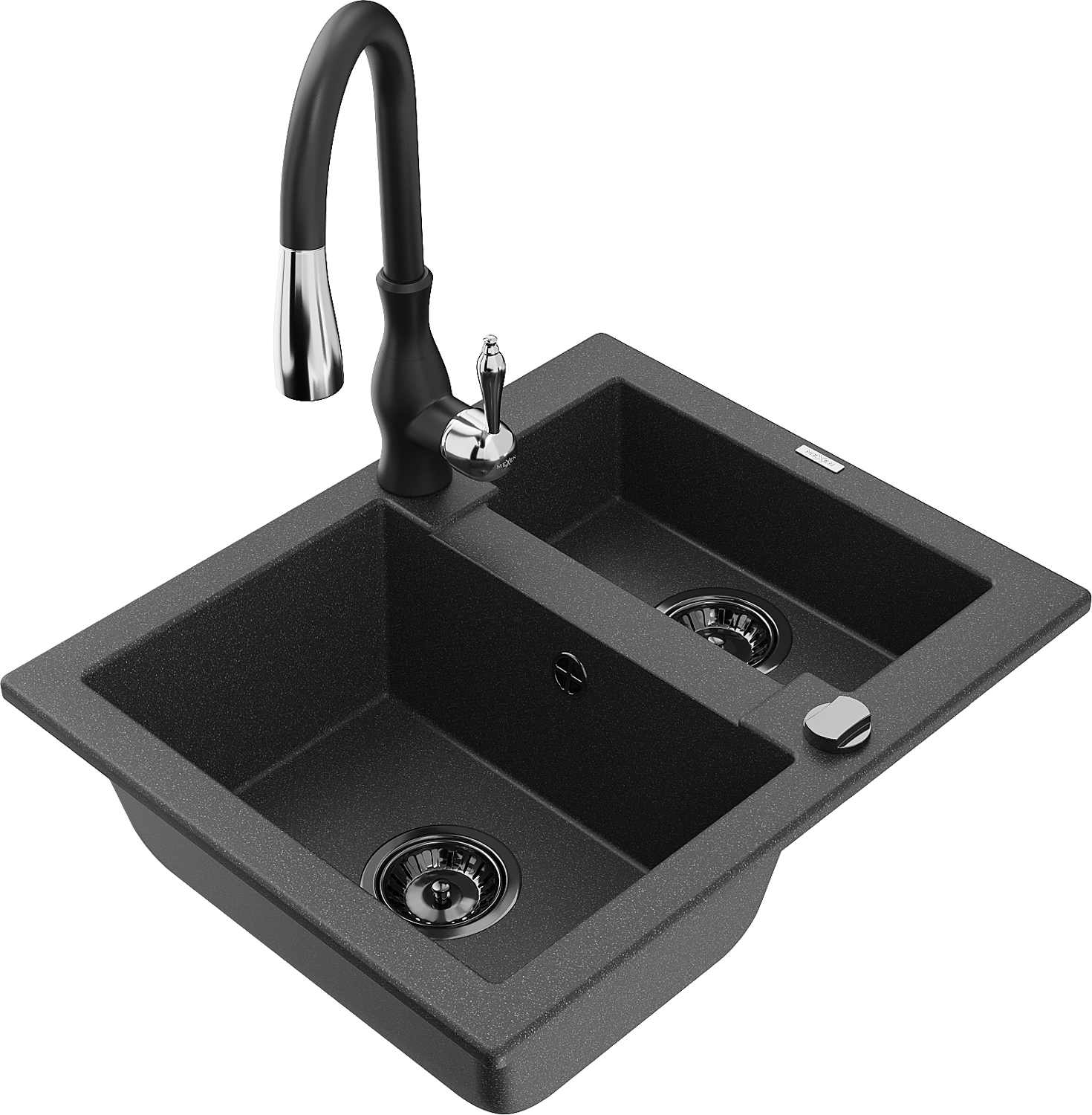 Mexen Carlos granitový drez 1,5-komorový s kuchynskou batériou Savita, čierny škvrnitý - 6518-76-672601-70-B