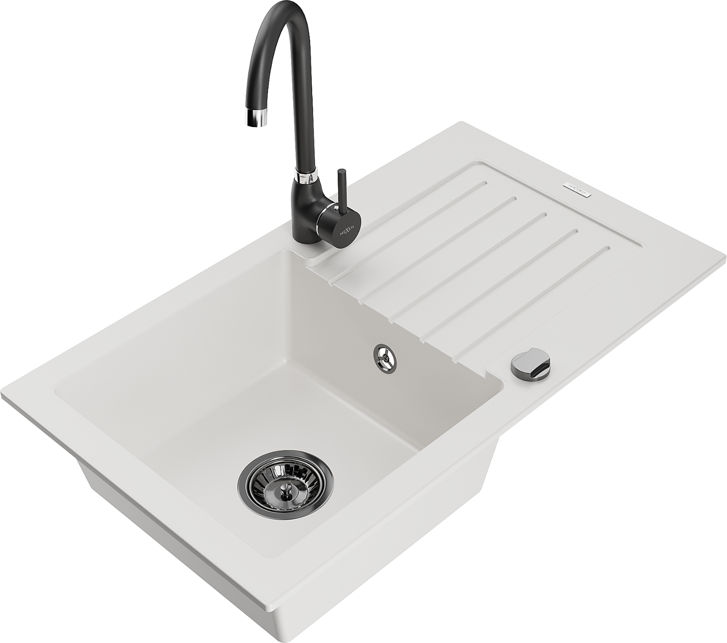 Mexen Pablo granitový kuchynský drez 1-komorový s odkvapkávačom a kuchynskou batériou Telma, biely - 6510-20-670200-70