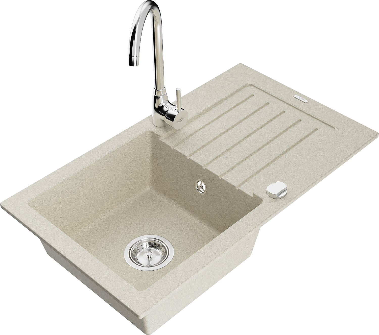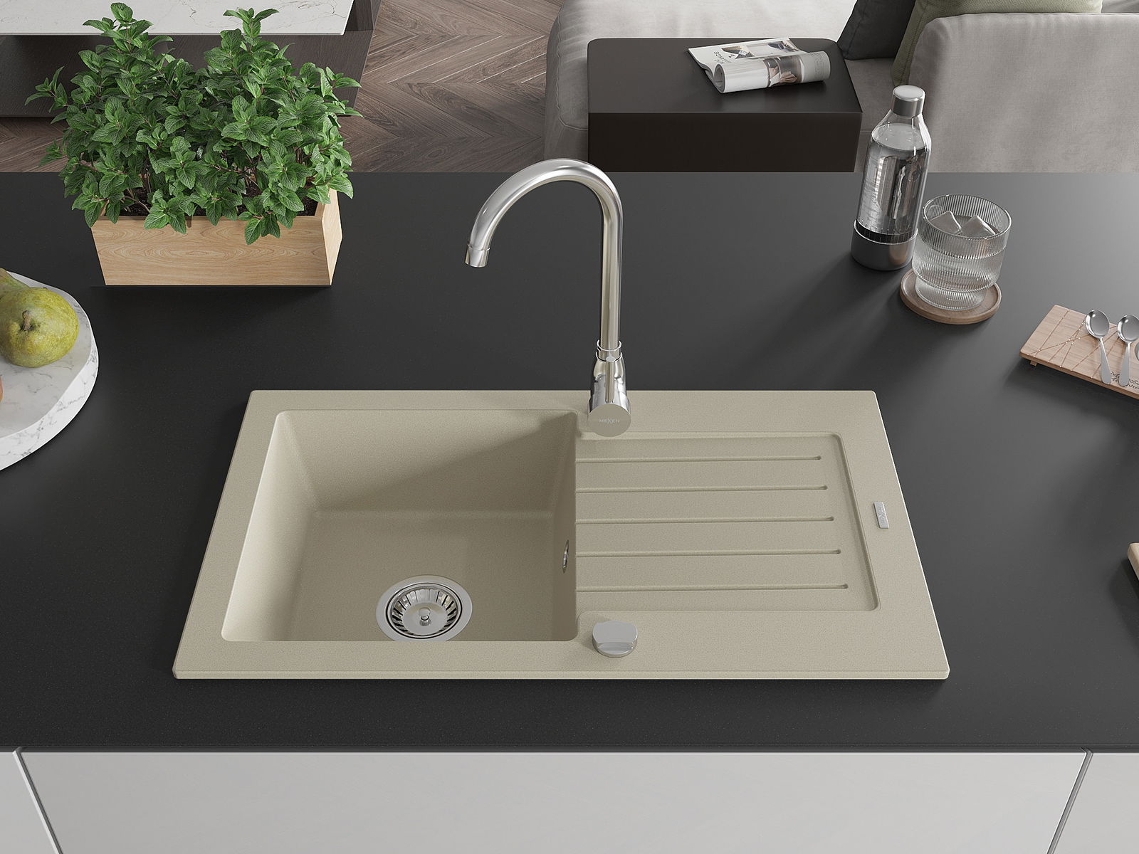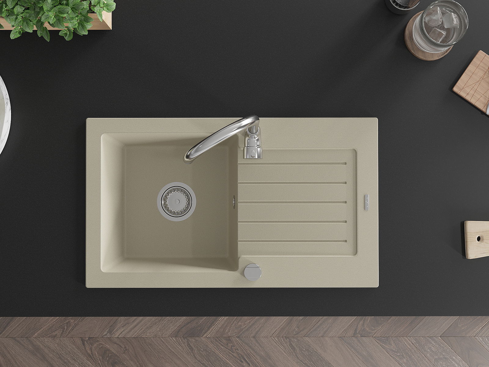 Mexen Pablo žulový drez s jednou komorou a odkvapkávacou doskou a kuchynskou batériou Telma, béžový - 6510-69-670200-00