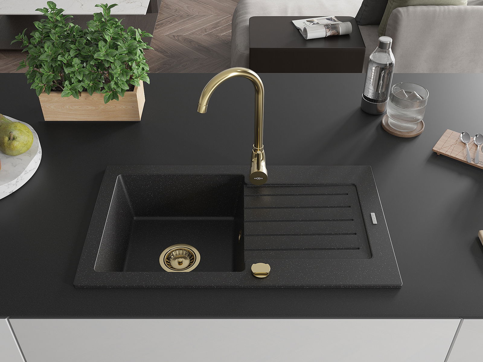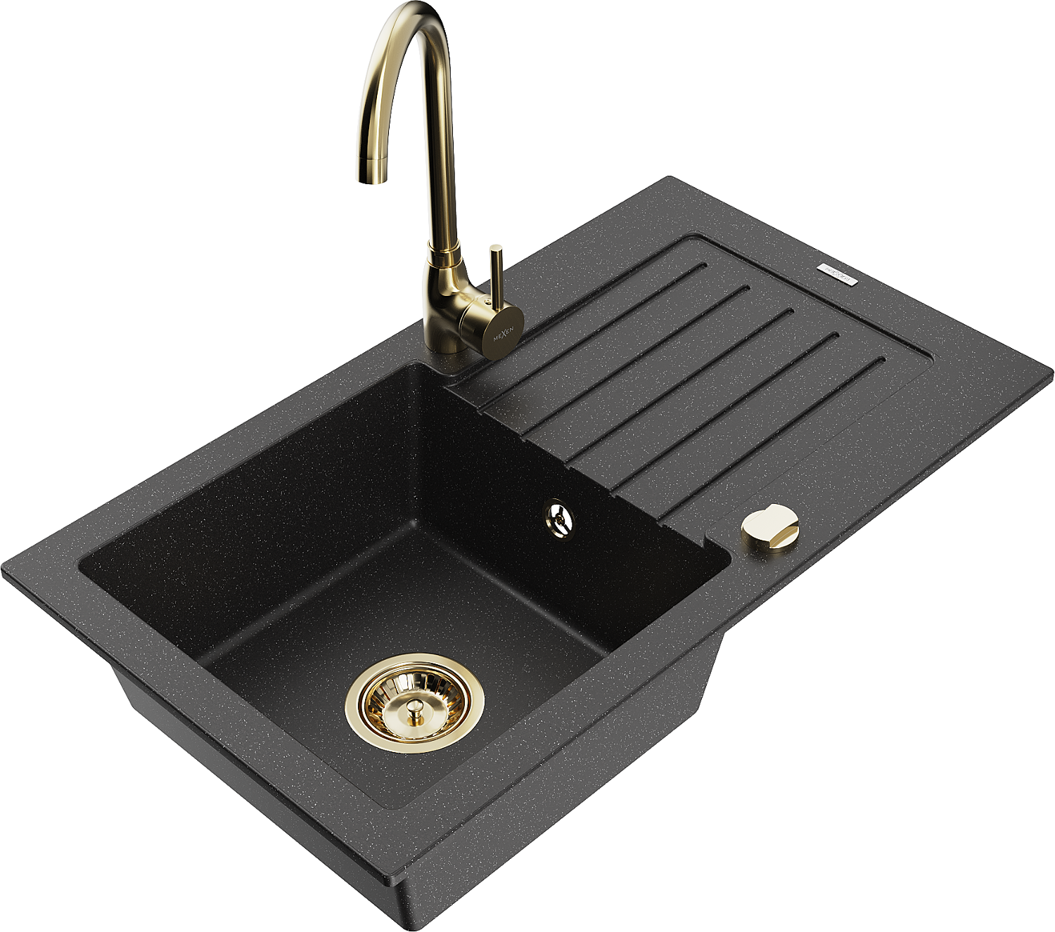 Mexen Pablo žulový drez 1-komorový s odkvapkávačom a kuchynskou batériou Telma, čierny/strieborný - 6510-73-670200-50