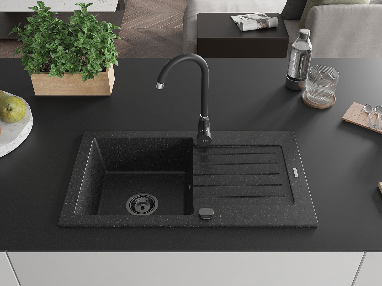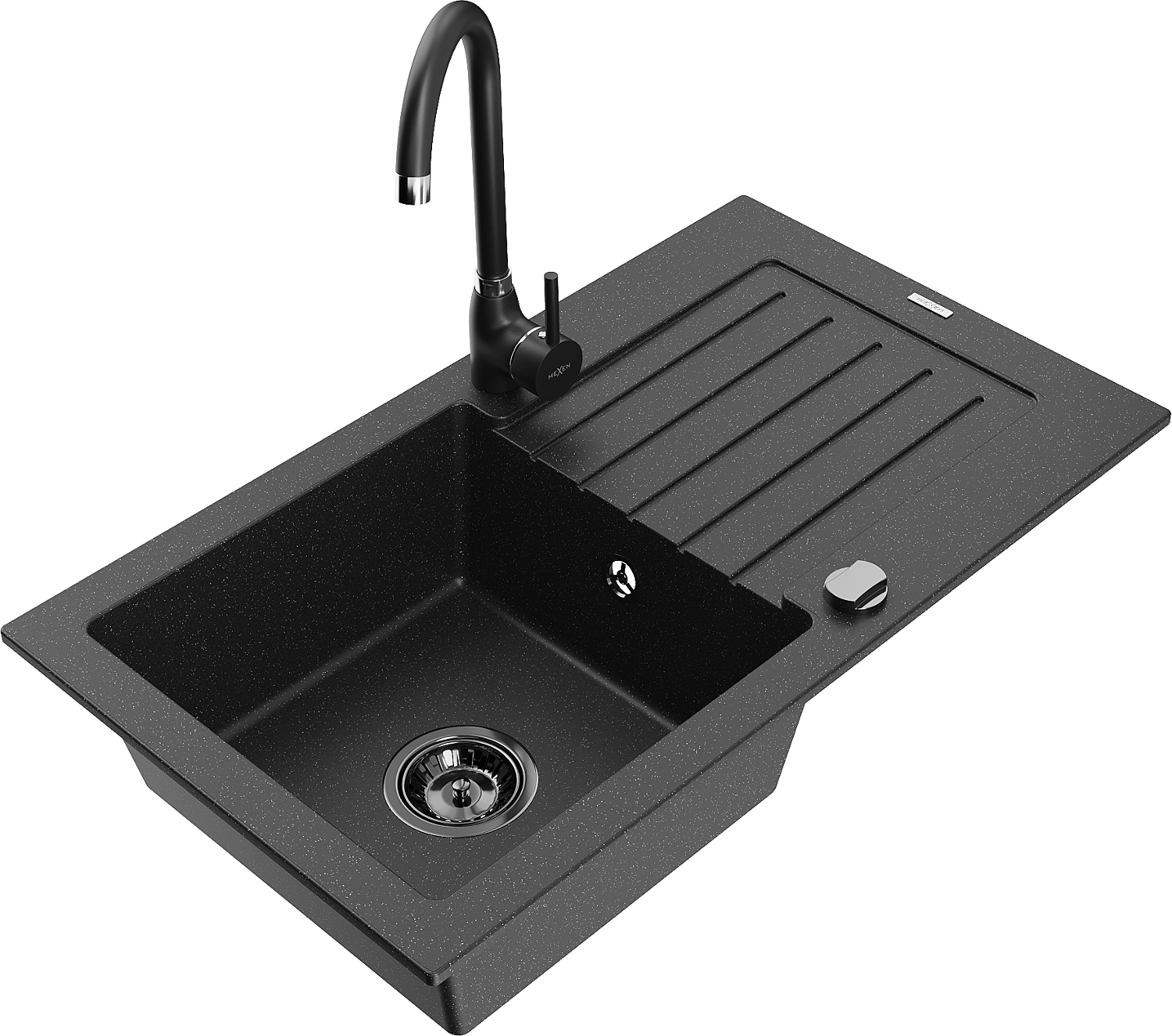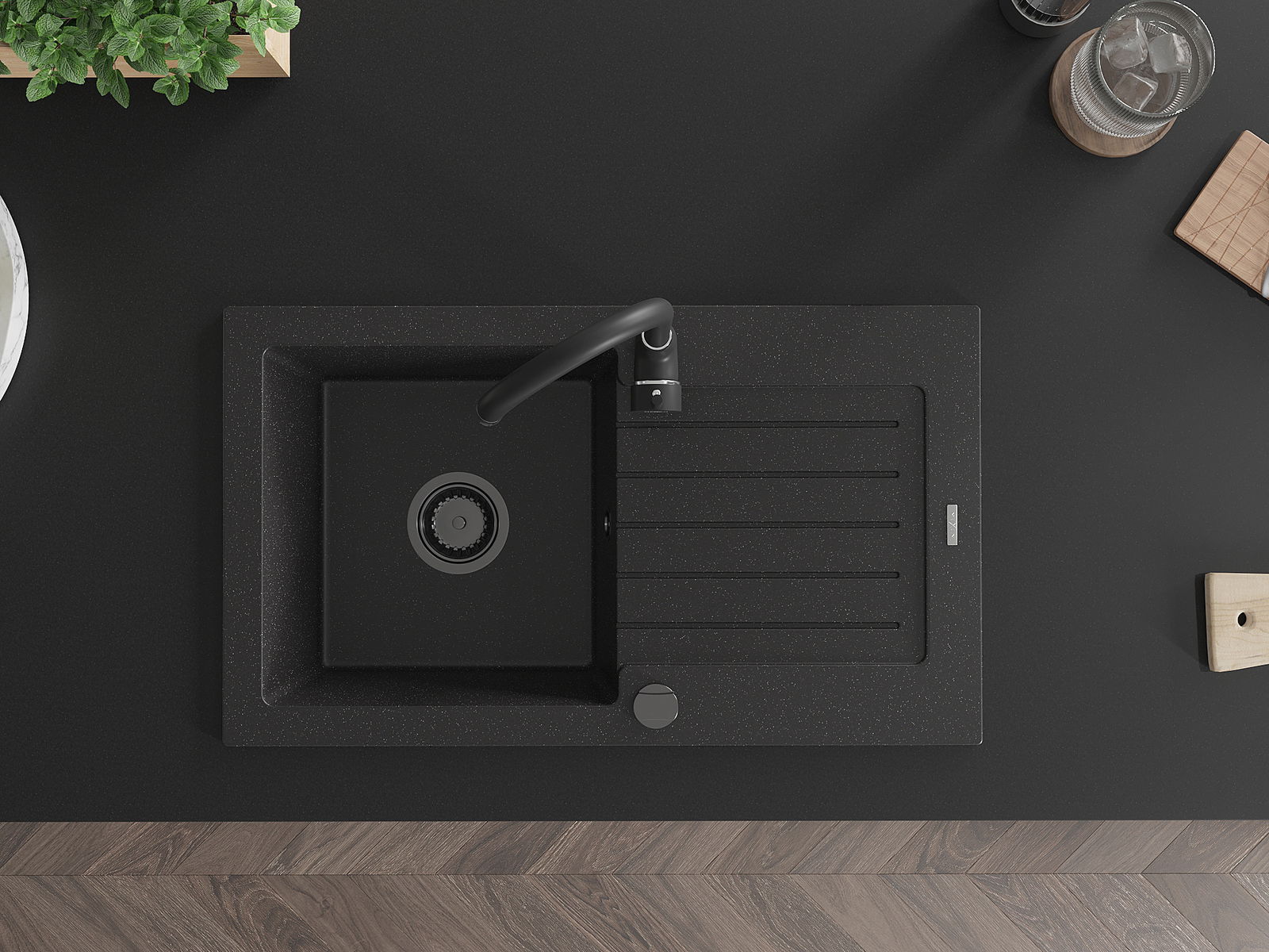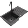 Mexen Pablo žulový drez 1-komorový s odkapávačom a kuchynskou batériou Telma, čierny/strieborný - 6510-73-670200-70-B