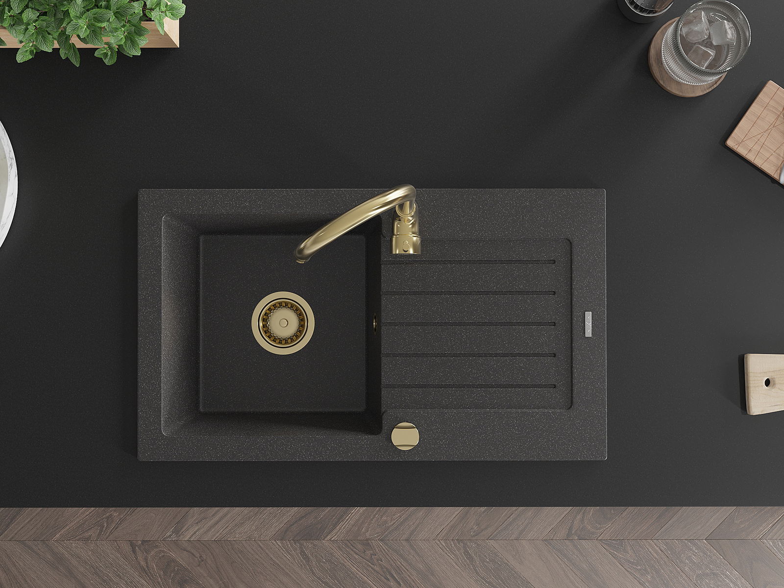 Mexen Pablo žulový jednodrez s odkvapkávacou plochou a kuchynskou batériou Telma, čierny škvrnitý - 6510-76-670200-50
