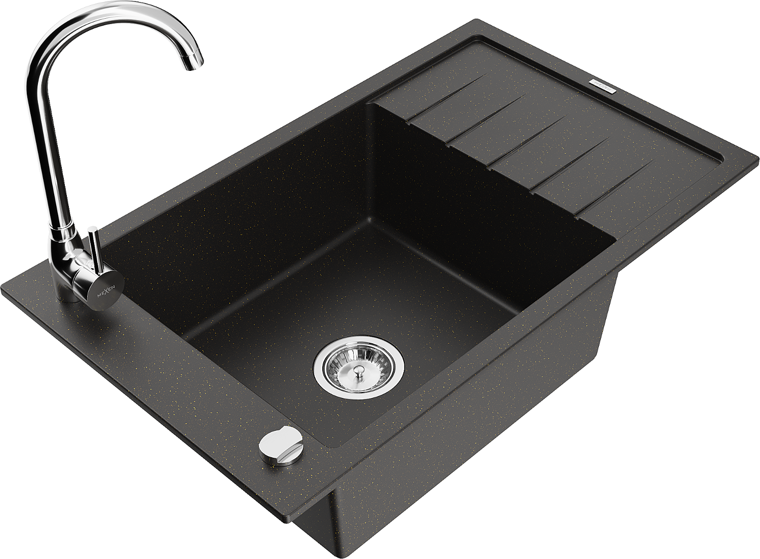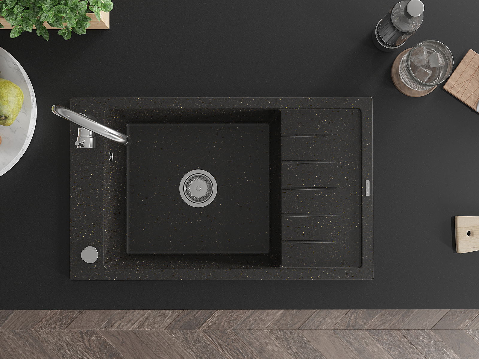 Mexen Elias žulový drez 1-komorový s odkvapkávačom a kuchynskou batériou Telma, čierna/zlatá - 6511-75-670200-00