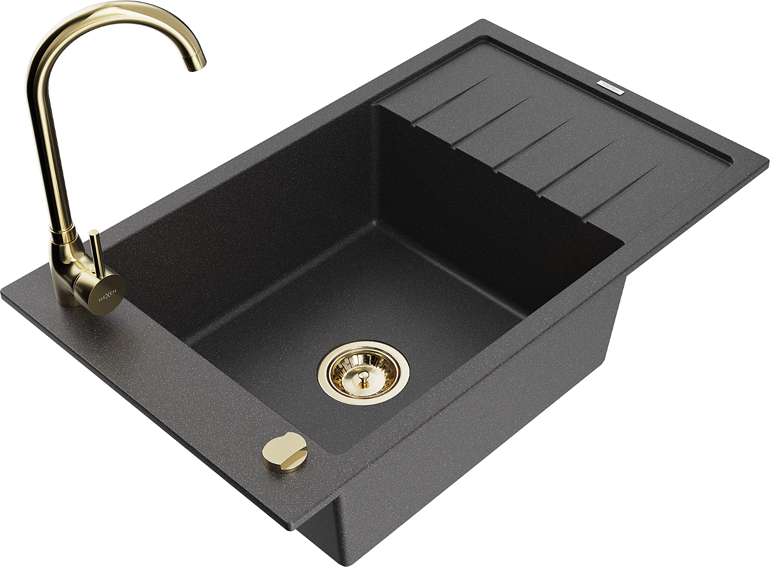 Mexen Elias žulový drez 1-komorový s odkvapkávačom a kuchynskou batériou Telma, čierny škvrnitý - 6511-76-670200-50