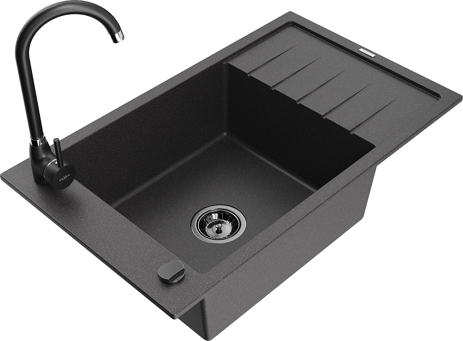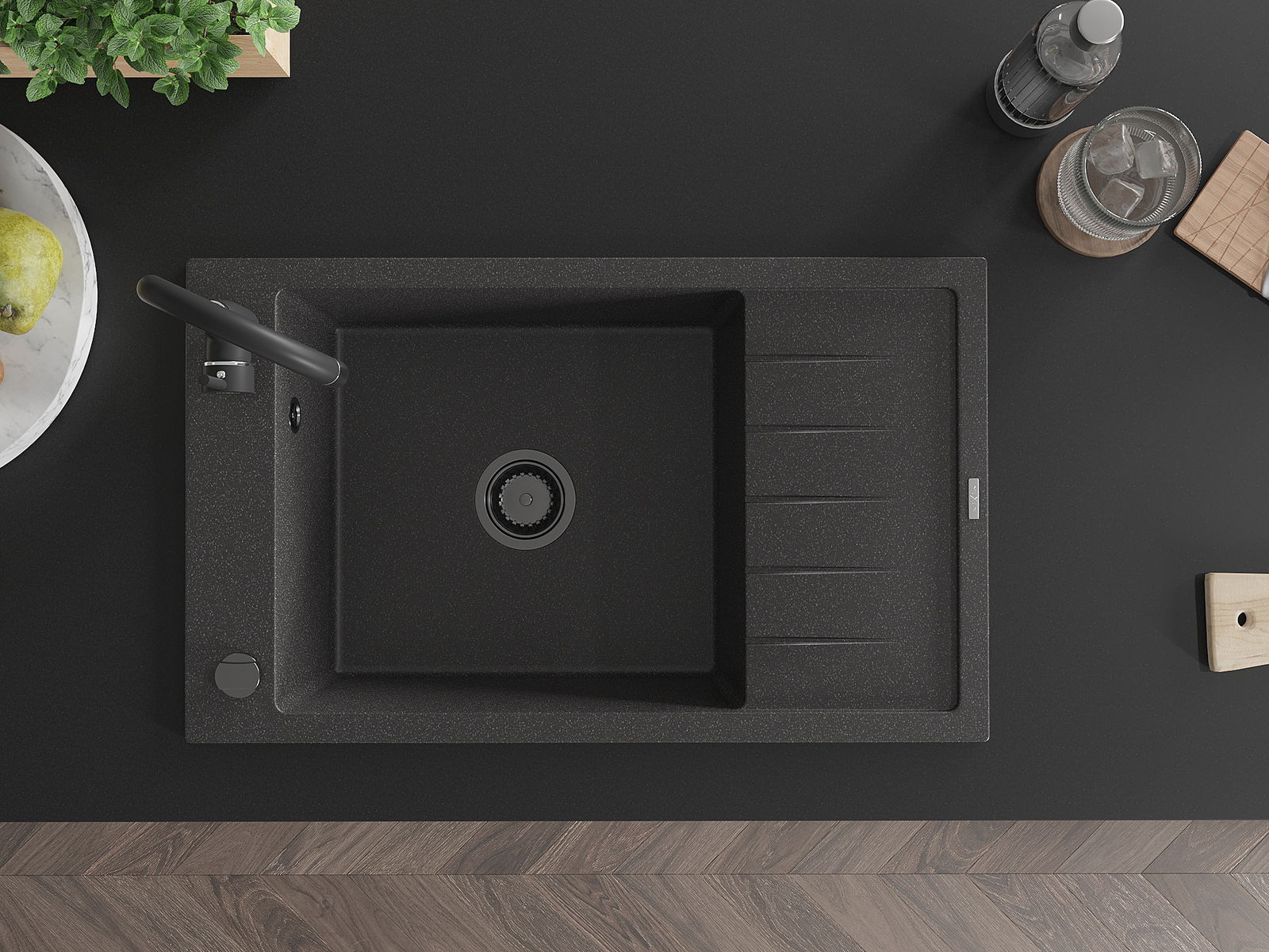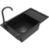 Mexen Elias granitový kuchynský drez s 1 komorou, odkvapkávačom a kuchynskou batériou Telma, čierny s bodkami