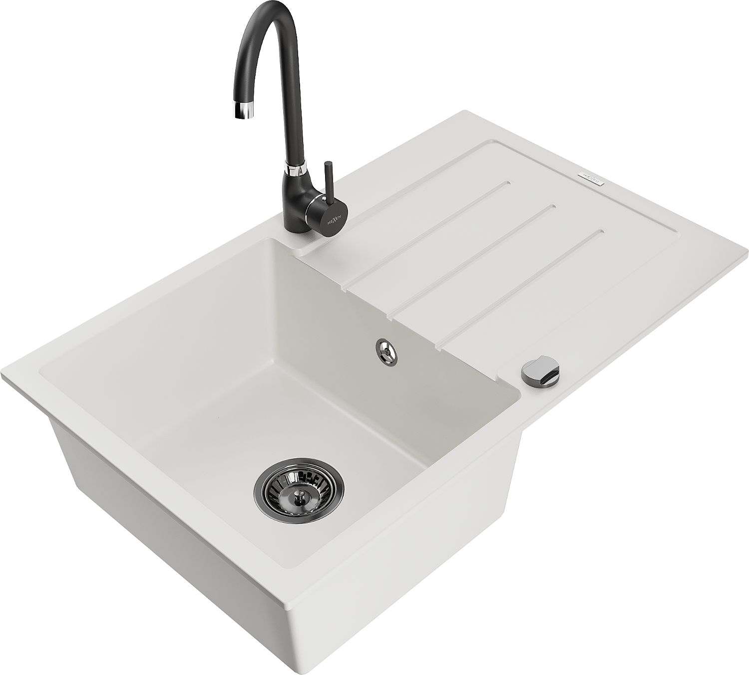 Mexen Bruno granitový drez 1-komorový s odkvapkávačom a kuchynskou batériou Telma, biely - 6513-20-670200-70