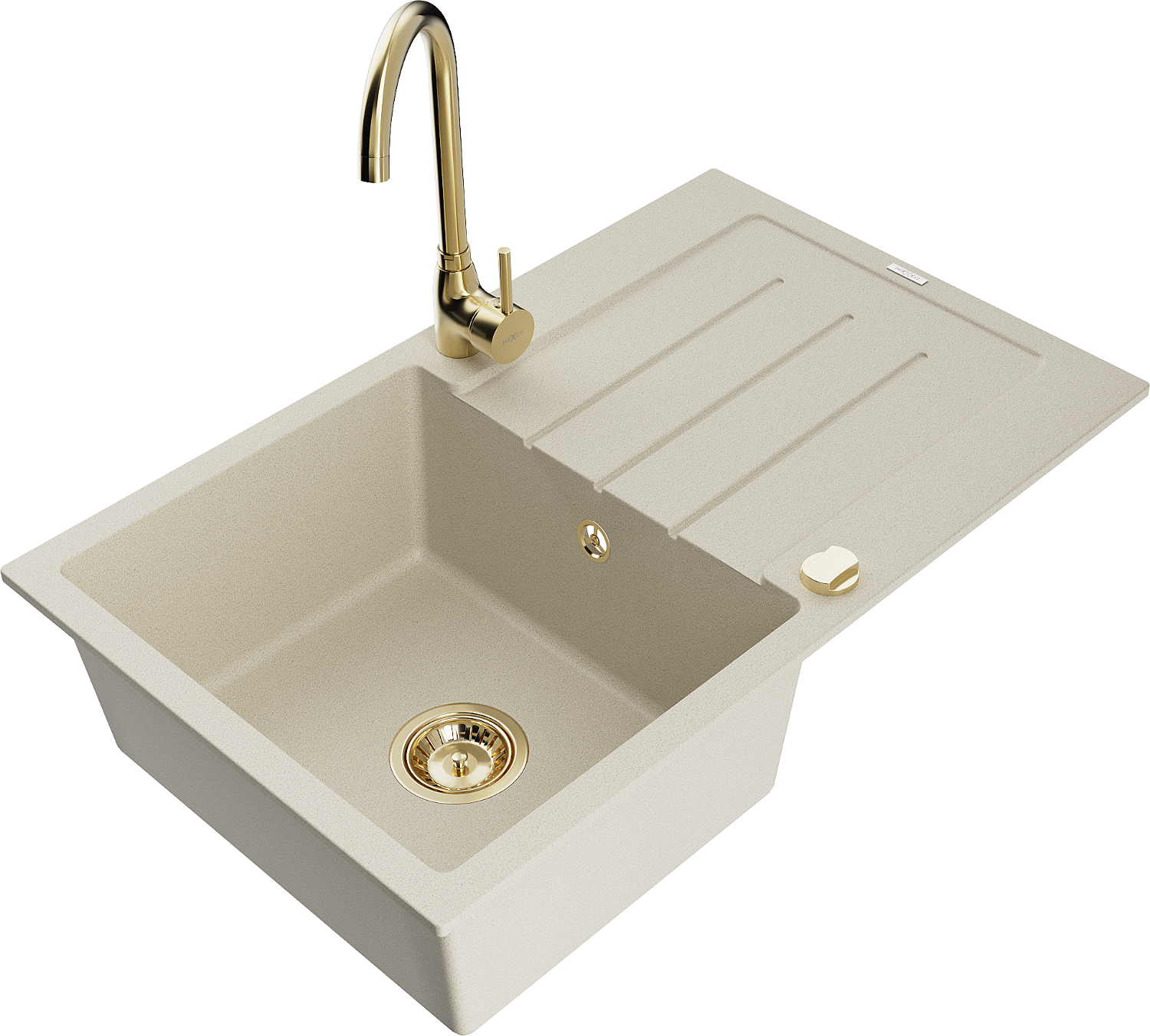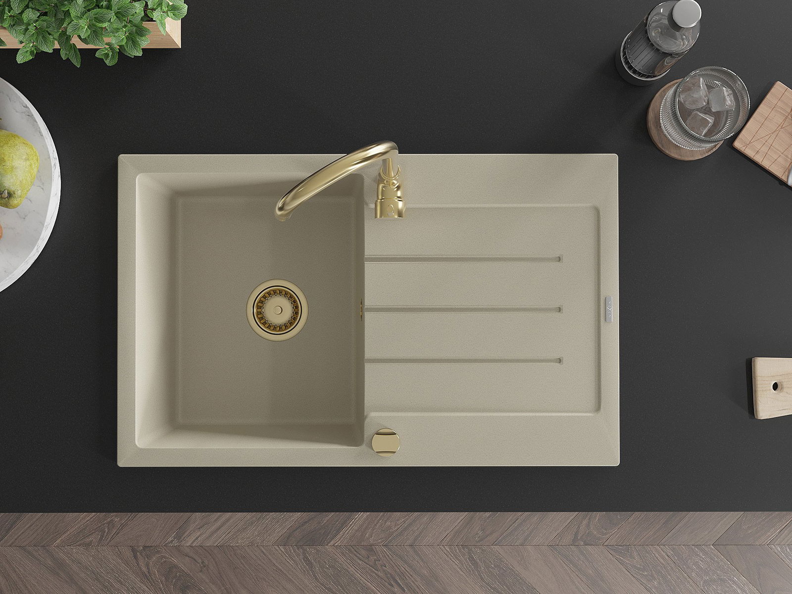 Mexen Bruno granitový drez 1-komorový s odkvapkávačom a kuchynskou batériou Telma, béžový - 6513-69-670200-50