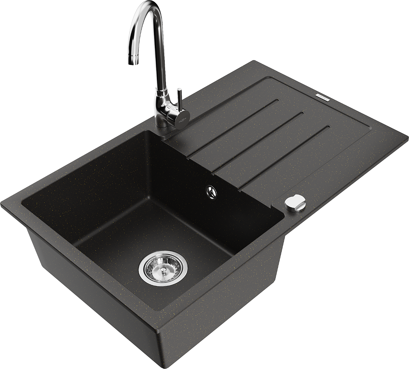 Mexen Bruno žulový drez 1-komorový s odkvapkávačom a kuchynskou batériou Telma, čierny/zlatý - 6513-75-670200-00