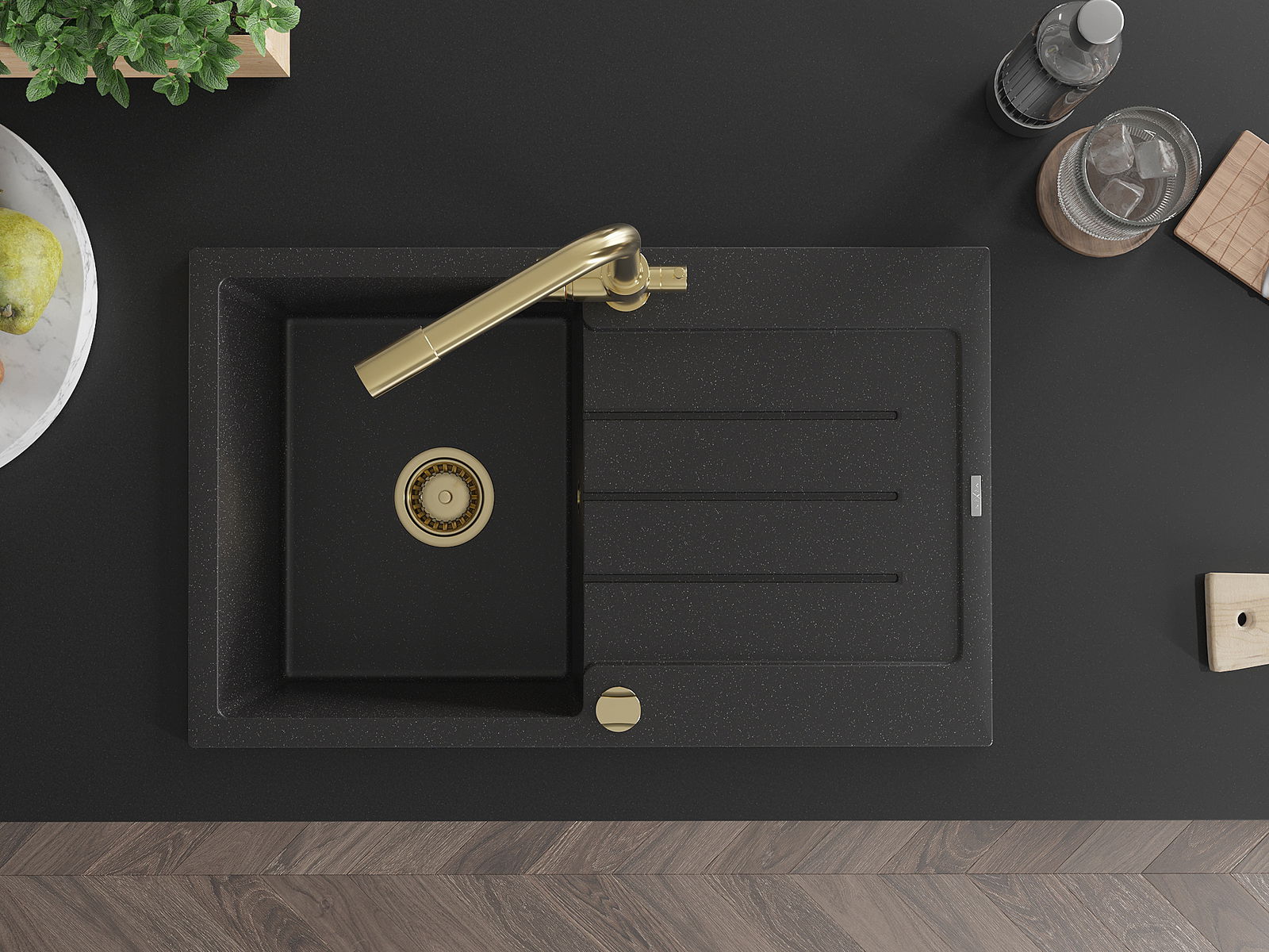 Mexen Bruno granitový jednodrez s odkvapkávačom a kuchynskou batériou Duero, čierna/strieborný metalik - 6513-73-671600-50