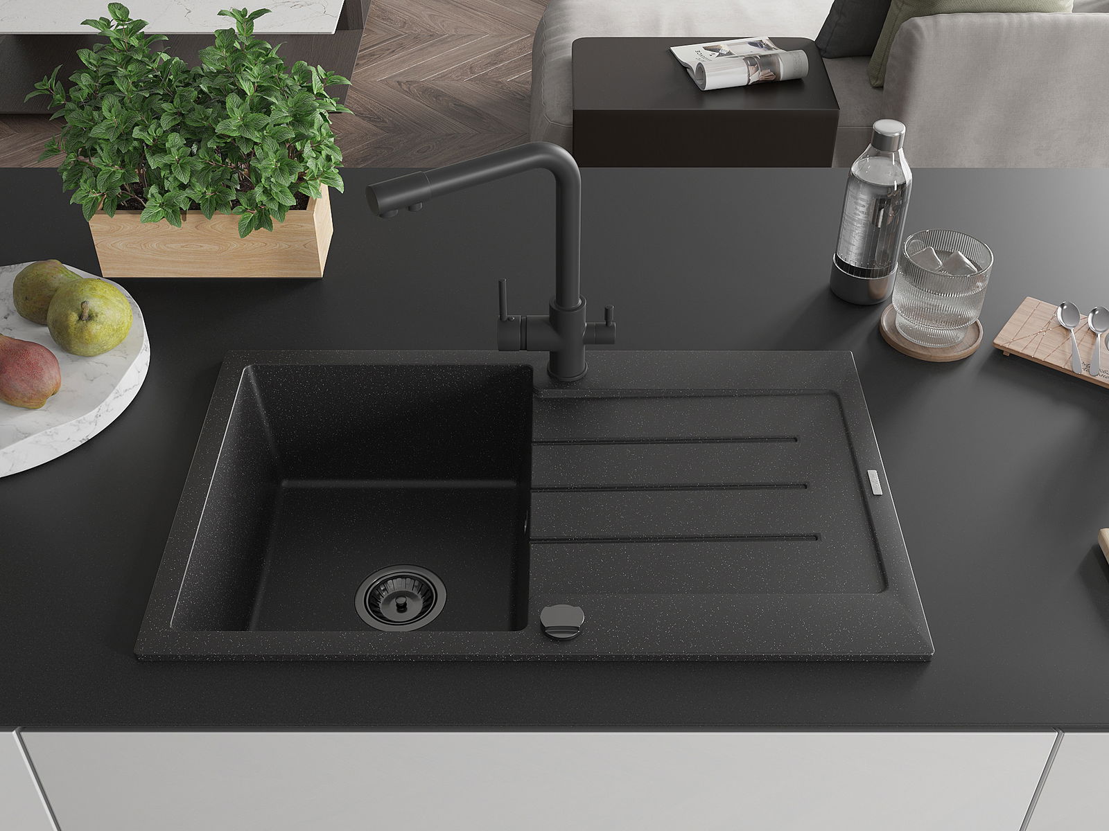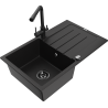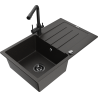 Mexen Bruno granitový drez s jednou komorou so sušičkou a kuchynskou batériou Duero, čierny/strieborný metalický