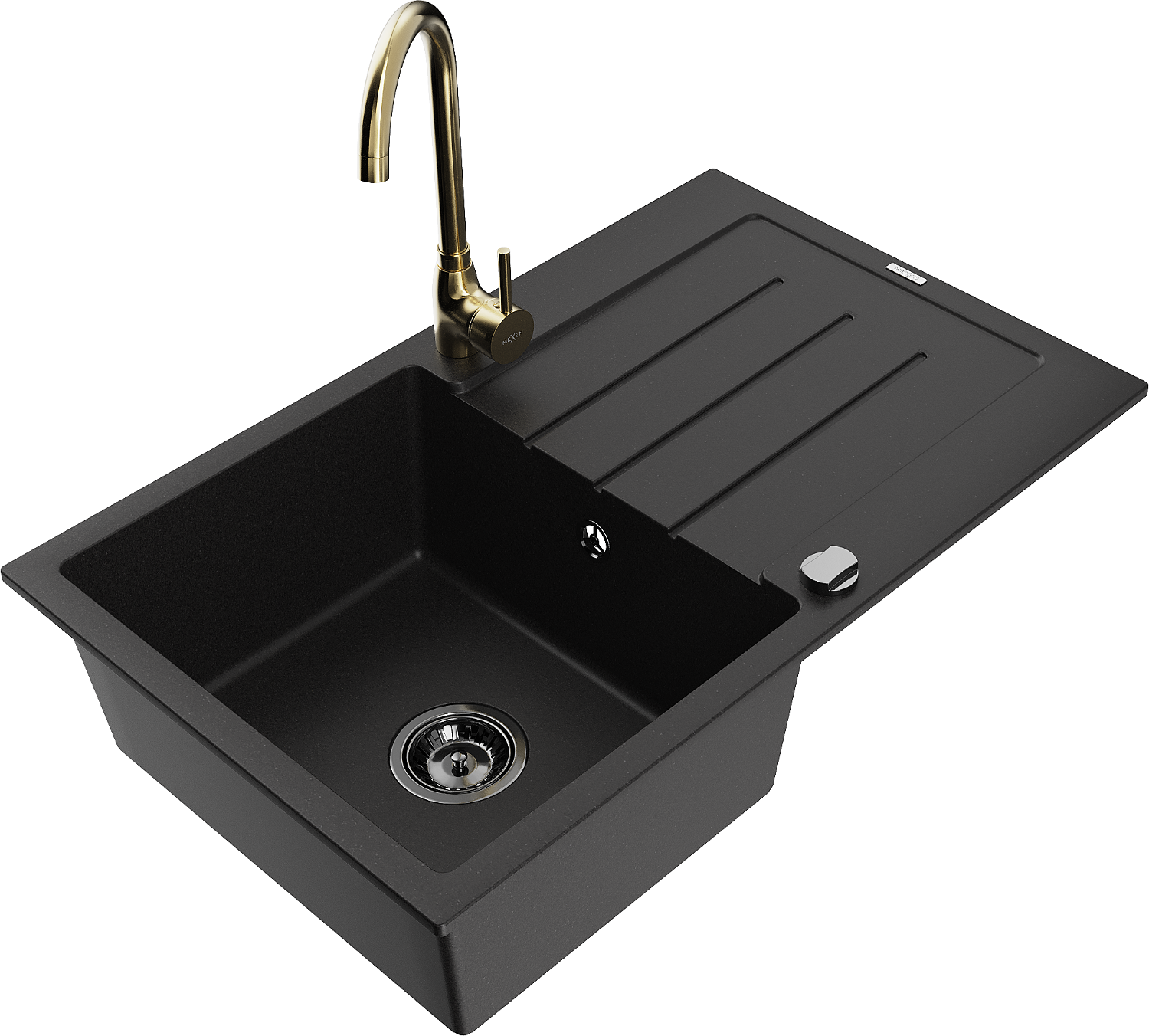 Mexen Bruno granitový kuchynský drez 1-komorový s odkvapkávačom a kuchynskou batériou Telma, čierny - 6513-77-670200-50-B