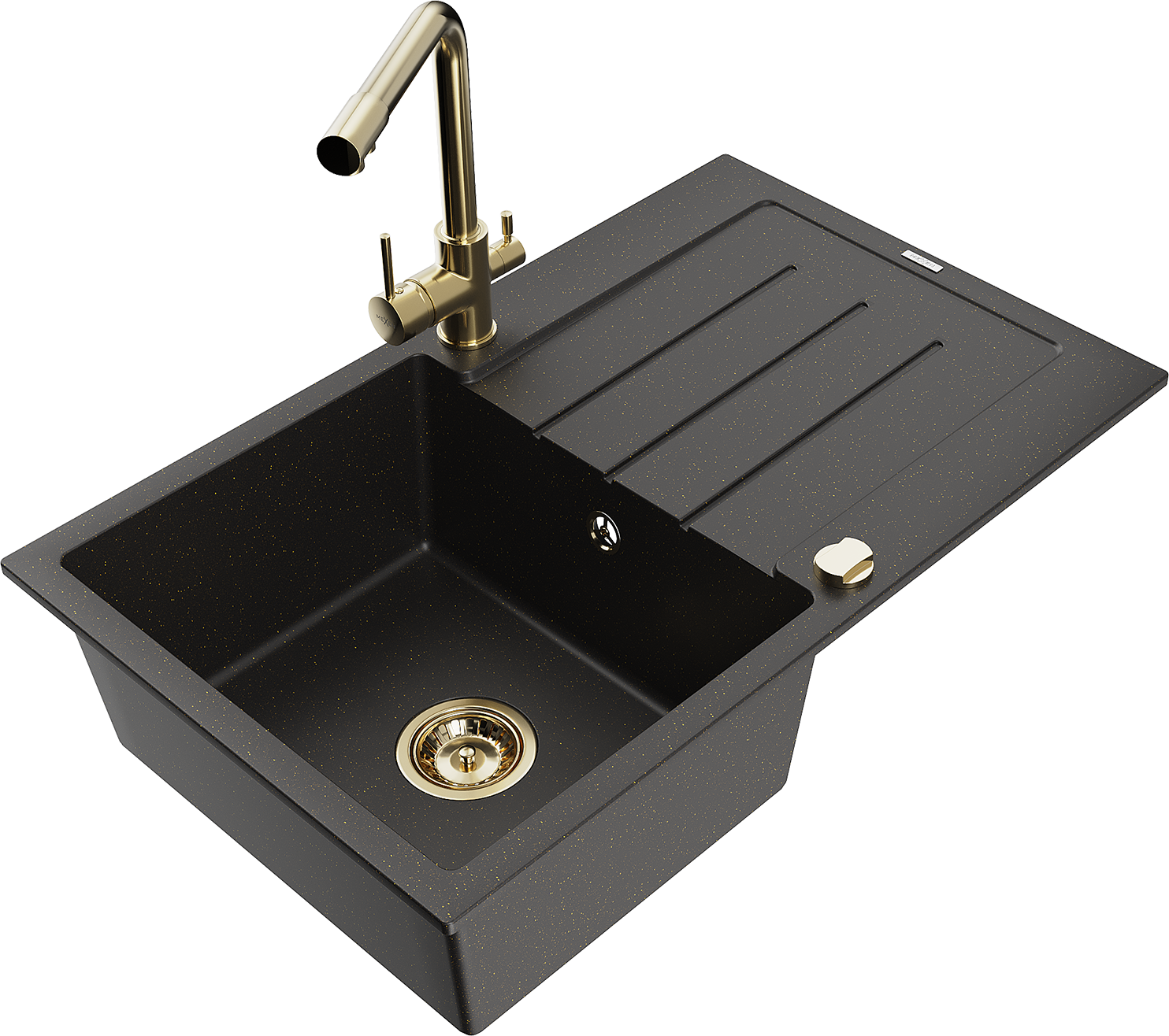 Mexen Bruno granitový drez s 1 komorou, odkvapkávačom a kuchynskou batériou Duero, čierny/zlatý metalik