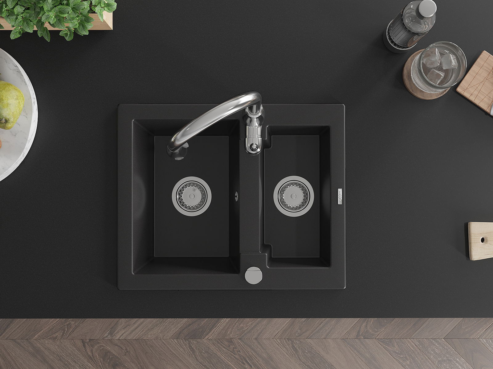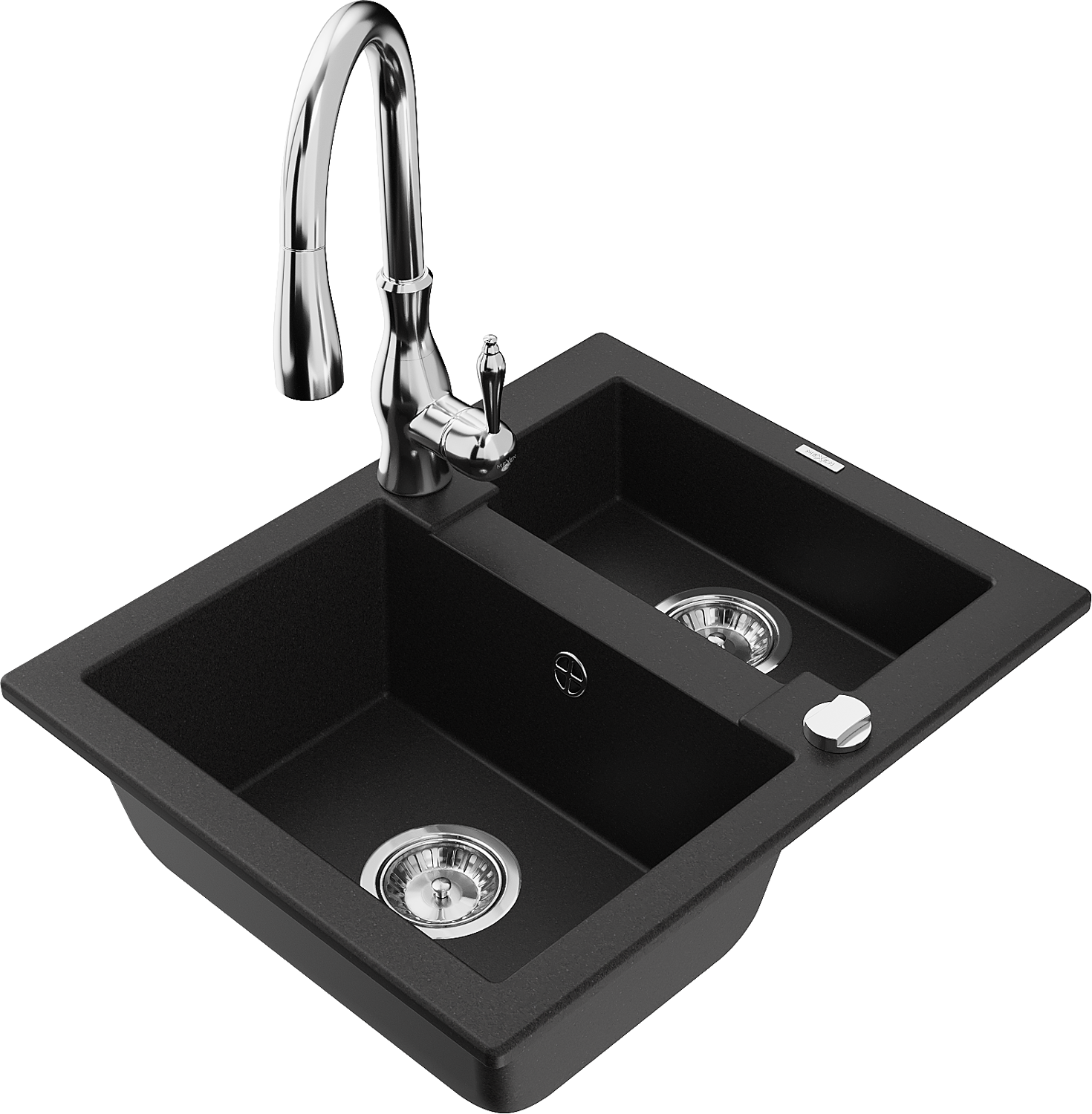 Mexen Carlos granitový drez 1,5-komorový s kuchynskou batériou Savita, čierny - 6518-77-672601-00