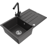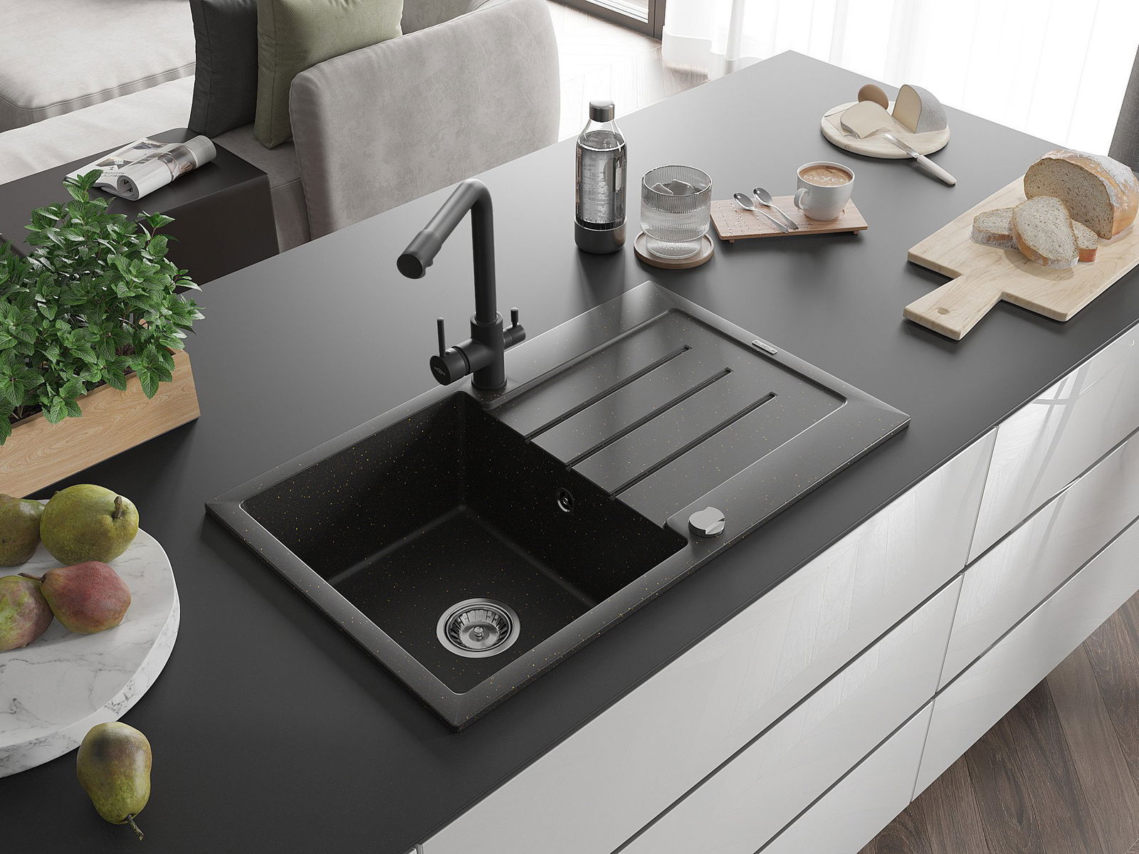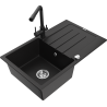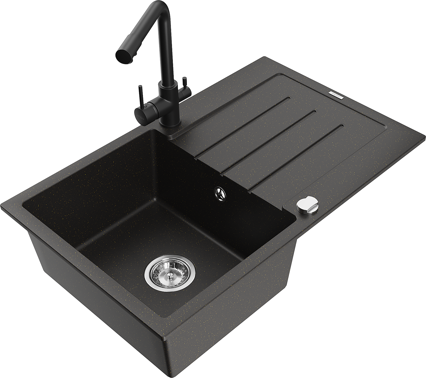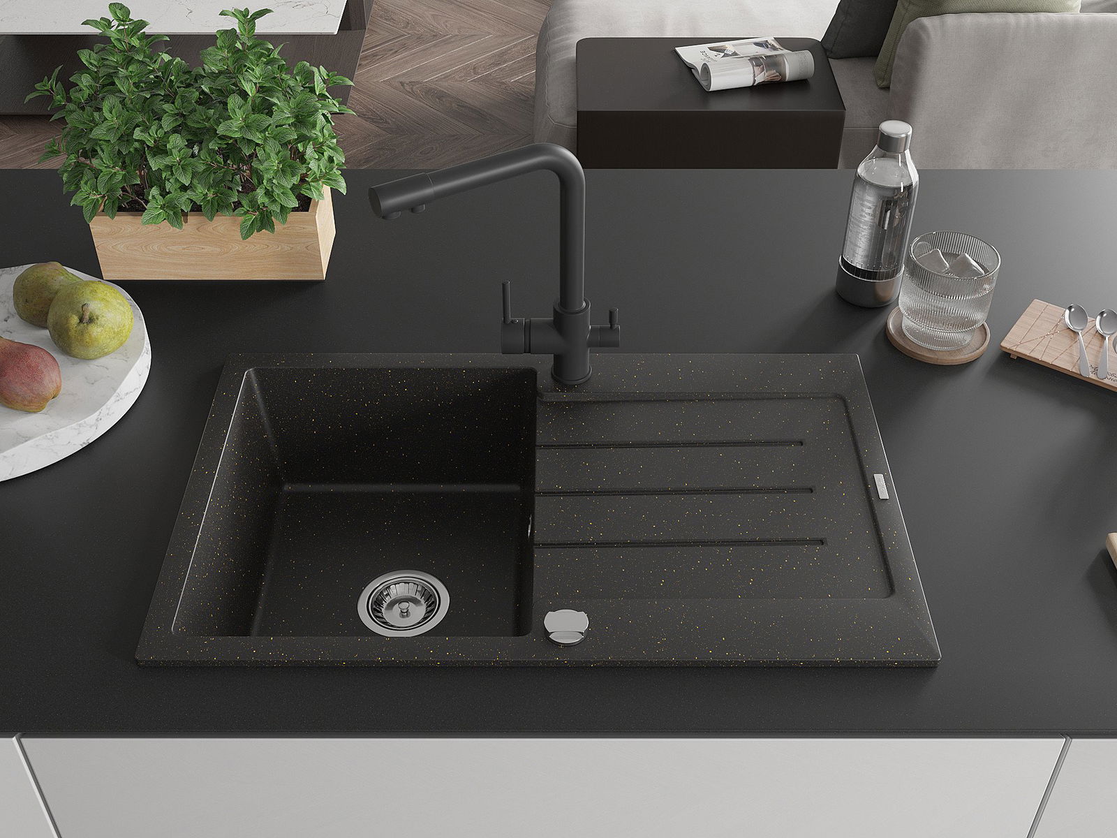 Mexen Bruno granitový drez s jednou komorou s odkvapkávačom a kuchynskou batériou Duero, čierny/zlatý metalický