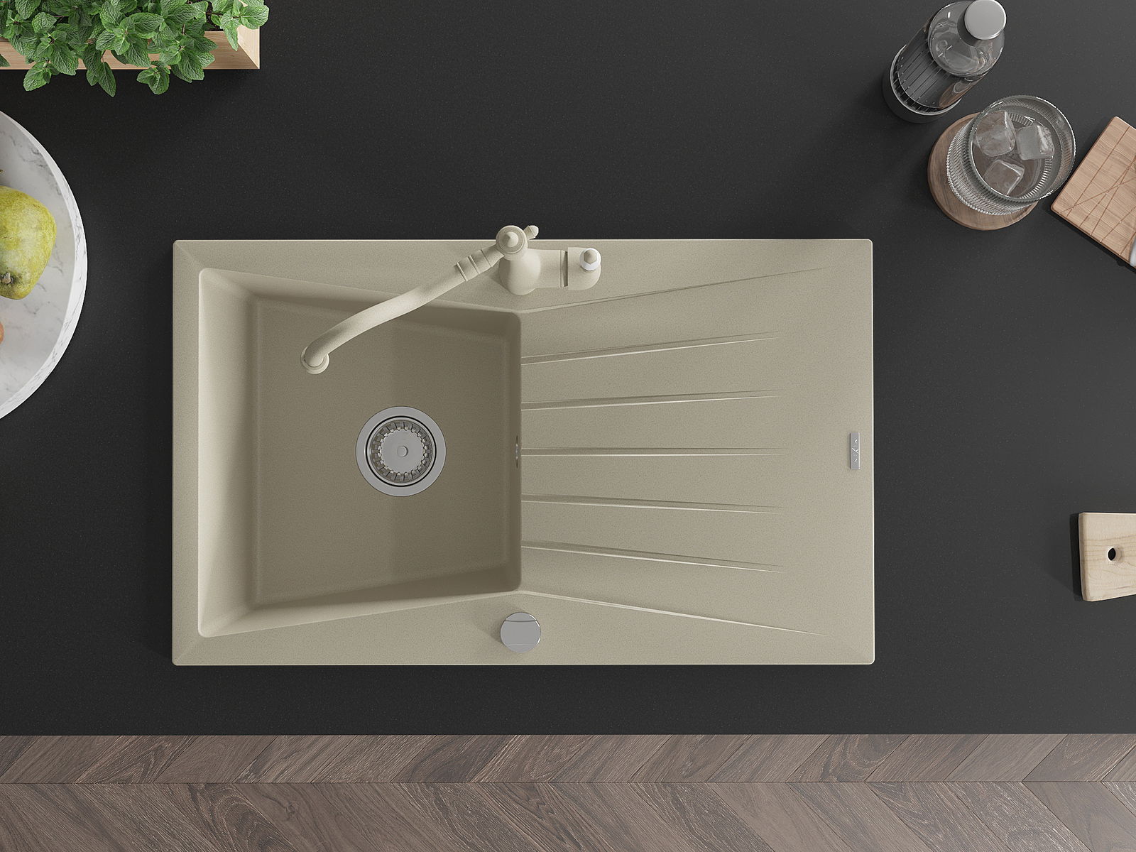 Povrch umývadla je odolný voči škvrnám a sfarbeniu, vďaka čomu sa ľahko čistí a zachováva si svoju farbu po dlhú dobu. Estetický a prakticky dopĺňajúci každú kuchyňu.