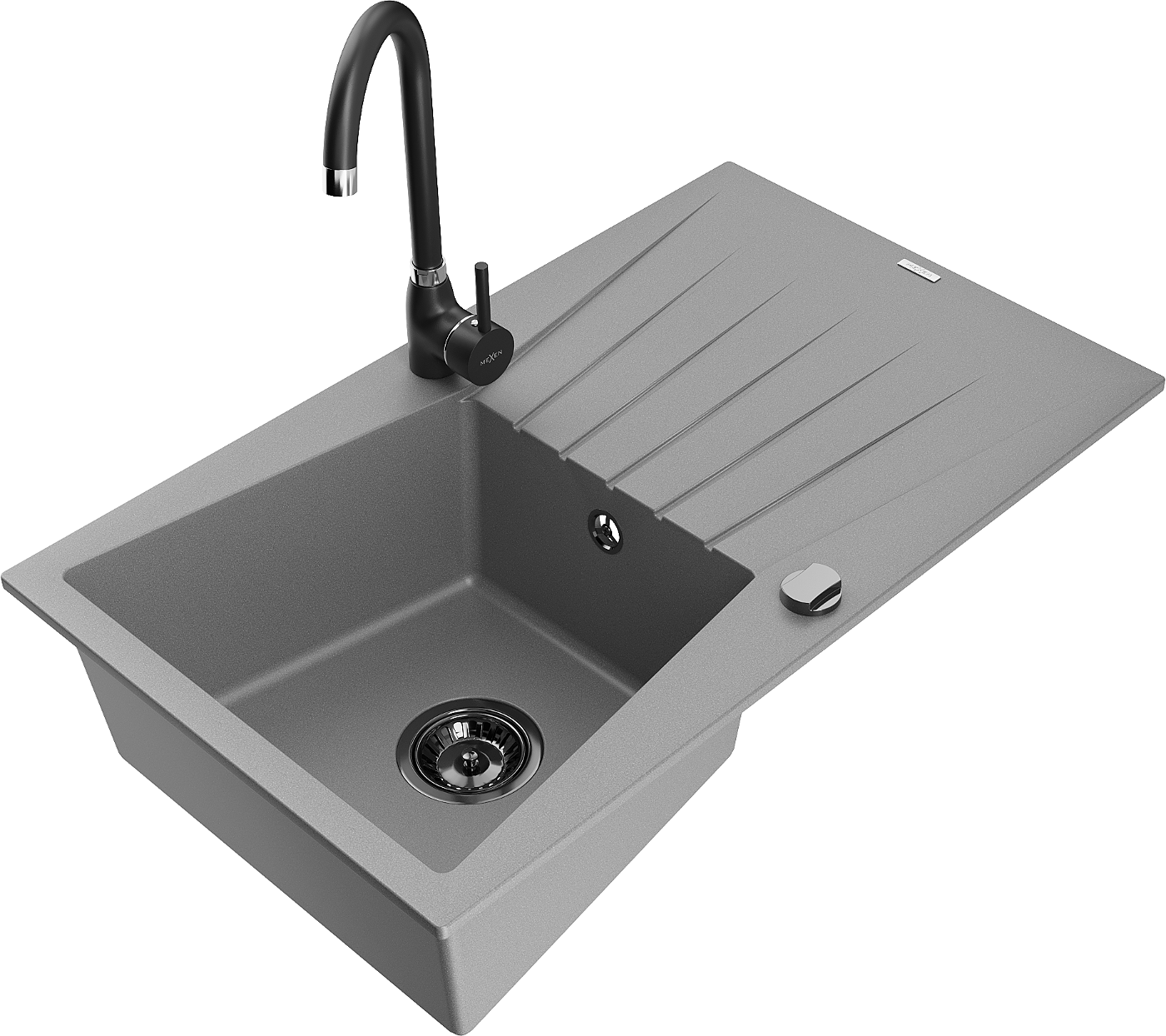Mexen Cesar žulový drez 1-komorový s odkvapkávačom a kuchynskou batériou Telma, sivý - 6514-71-670200-70-B