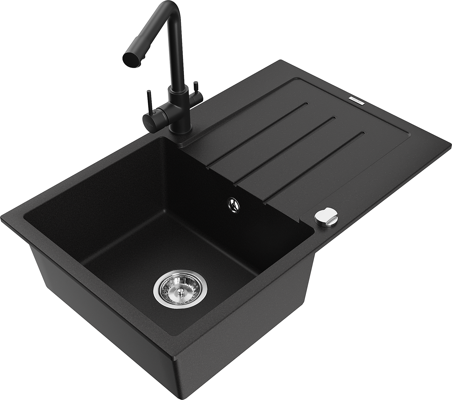 Mexen Bruno žulový drez 1-komorový s odkvapkávačom a kuchynskou batériou Duero, čierny - 6513-77-671600-70