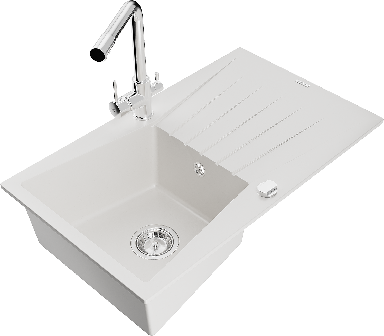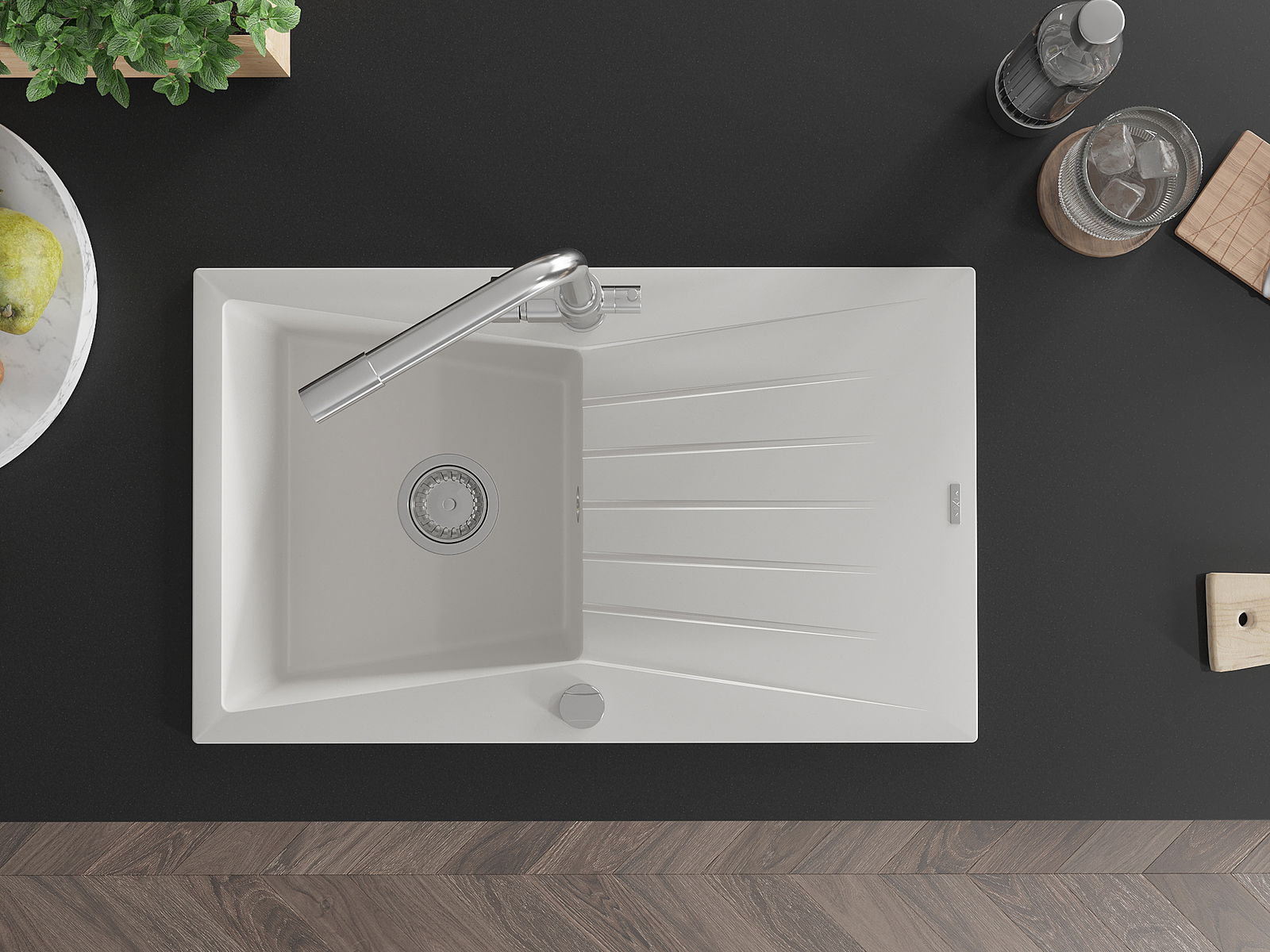 Mexen Cesar žulový drez 1-komorový s odkvapkávačom a kuchynskou batériou Duero, biely - 6514-20-671600-00