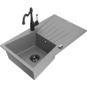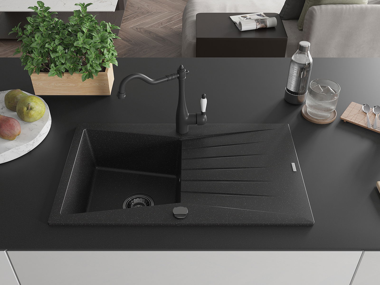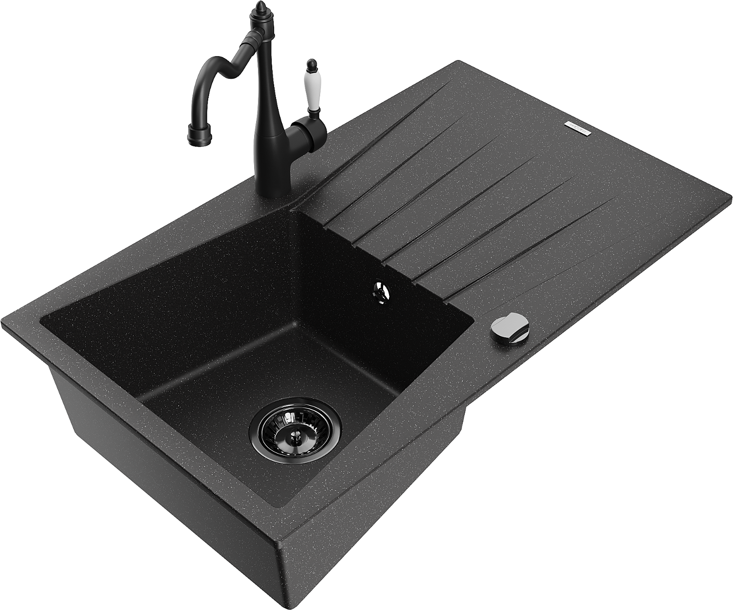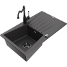 Mexen Cesar granitový kuchynský drez s 1 komorou, odkvapkávačom a kuchynskou batériou Carla, čierny/strieborný metalický