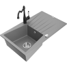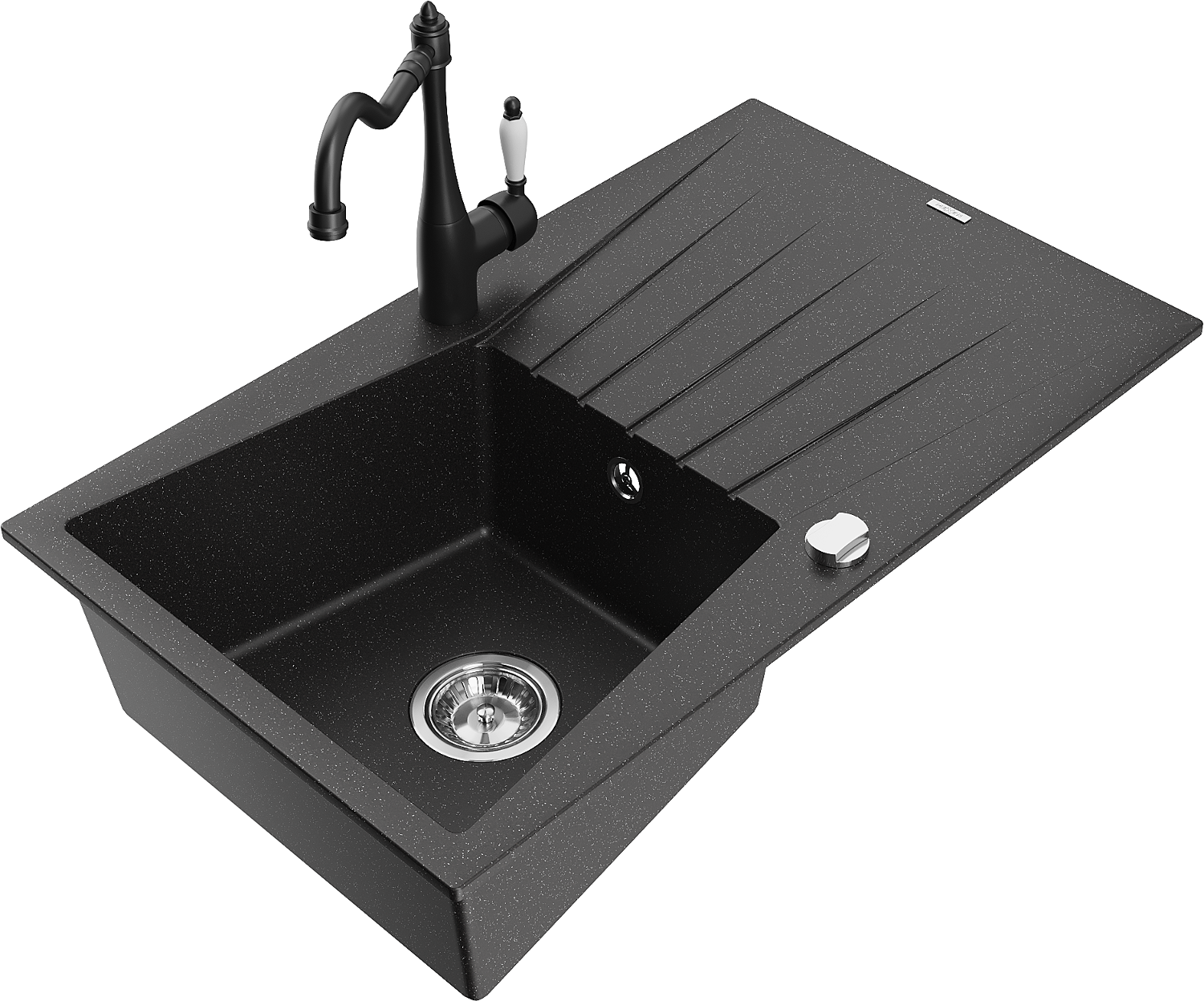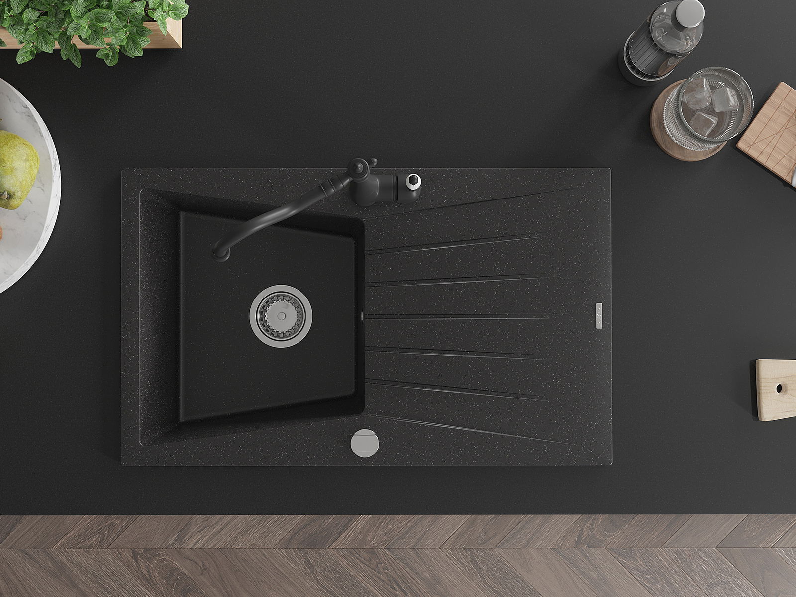 Mexen Cesar granitový drez s jednou komorou, odkvapkávačom a kuchynskou batériou Carla, čierny/strieborný metalický