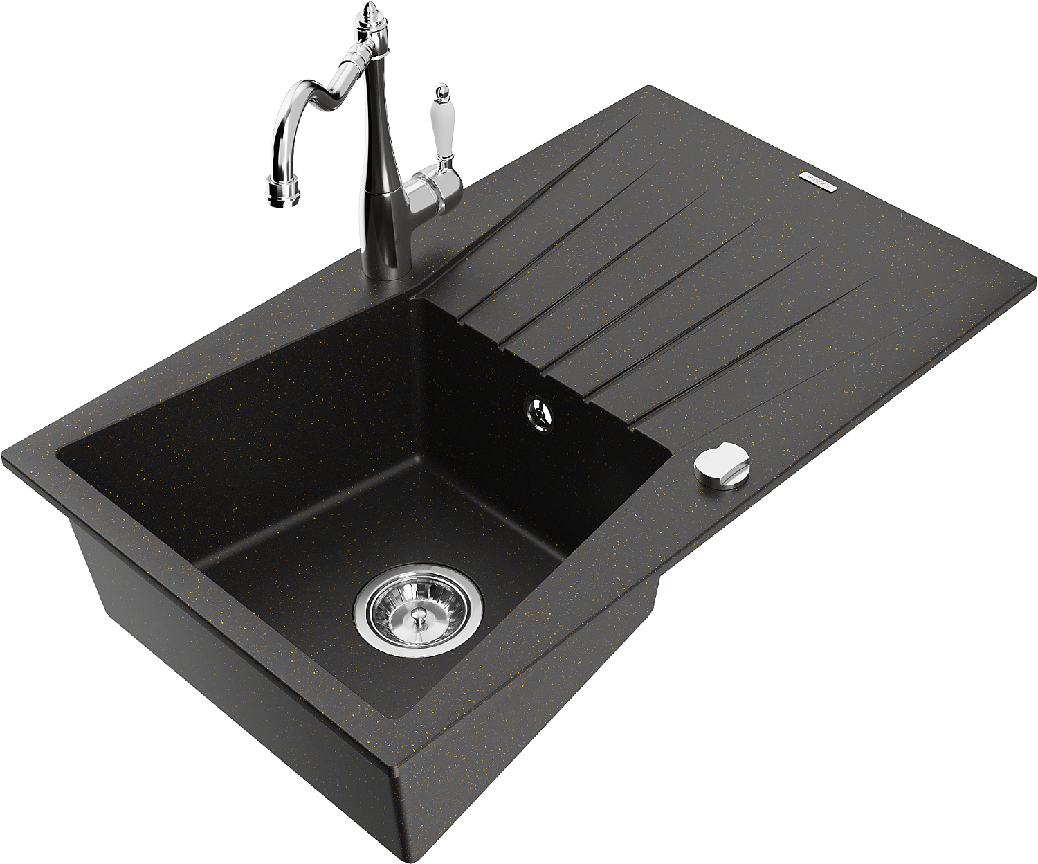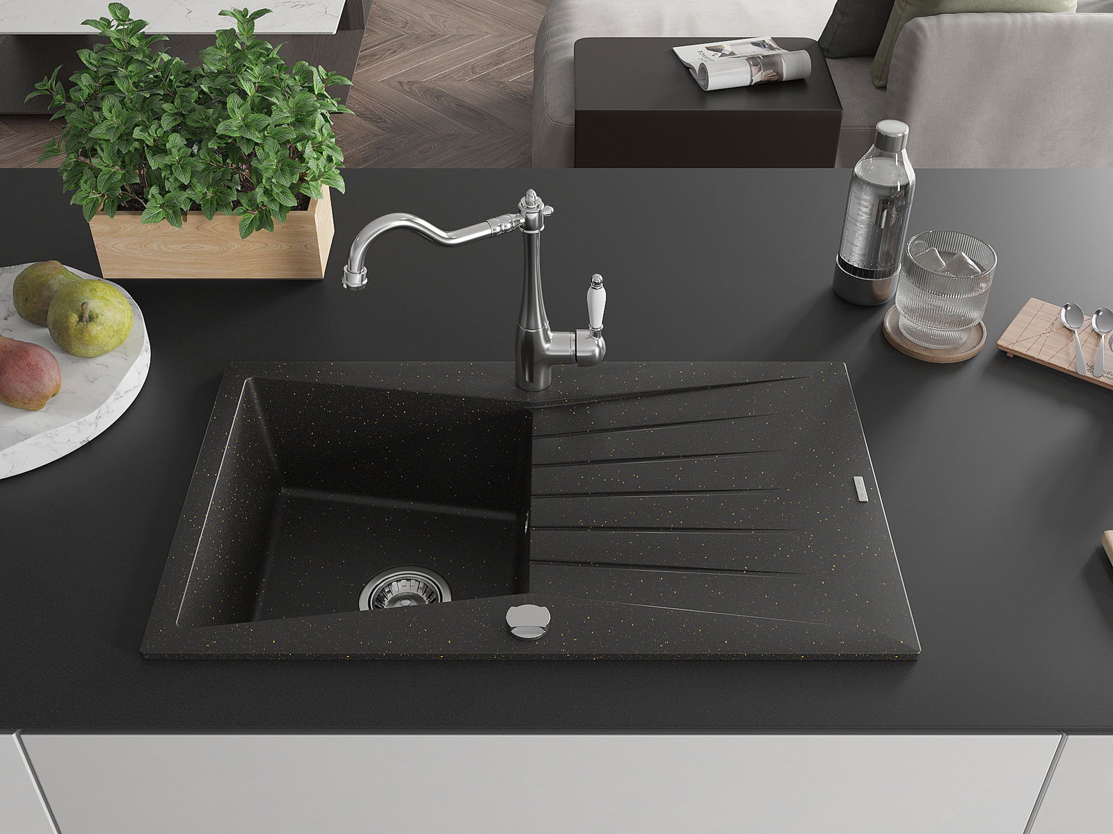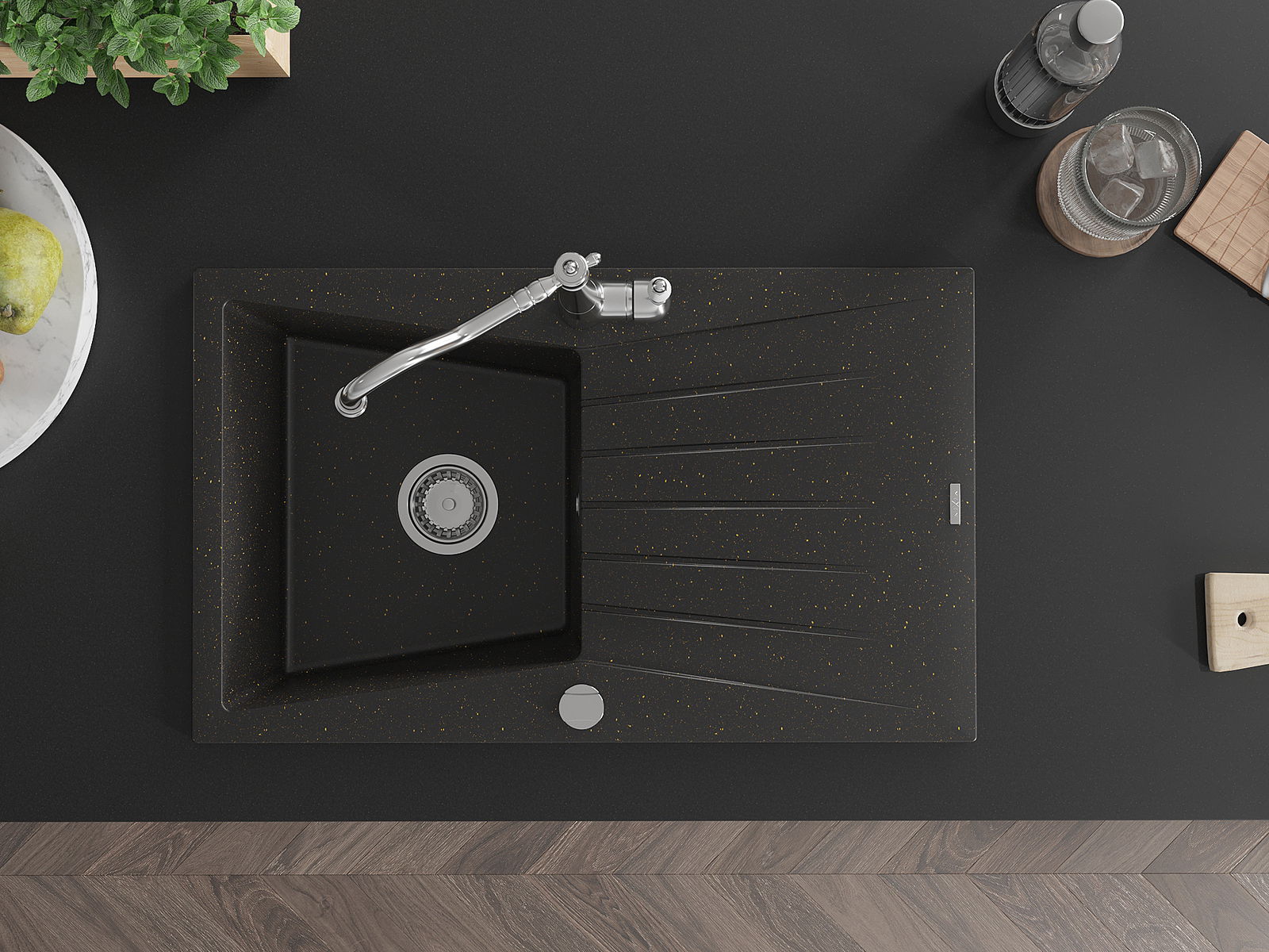 Mexen Cesar granitový drez s 1-komorou s odkvapkávačom a kuchynskou batériou Carla, čierny/zlatý metalik - 6514-75-670700-00
