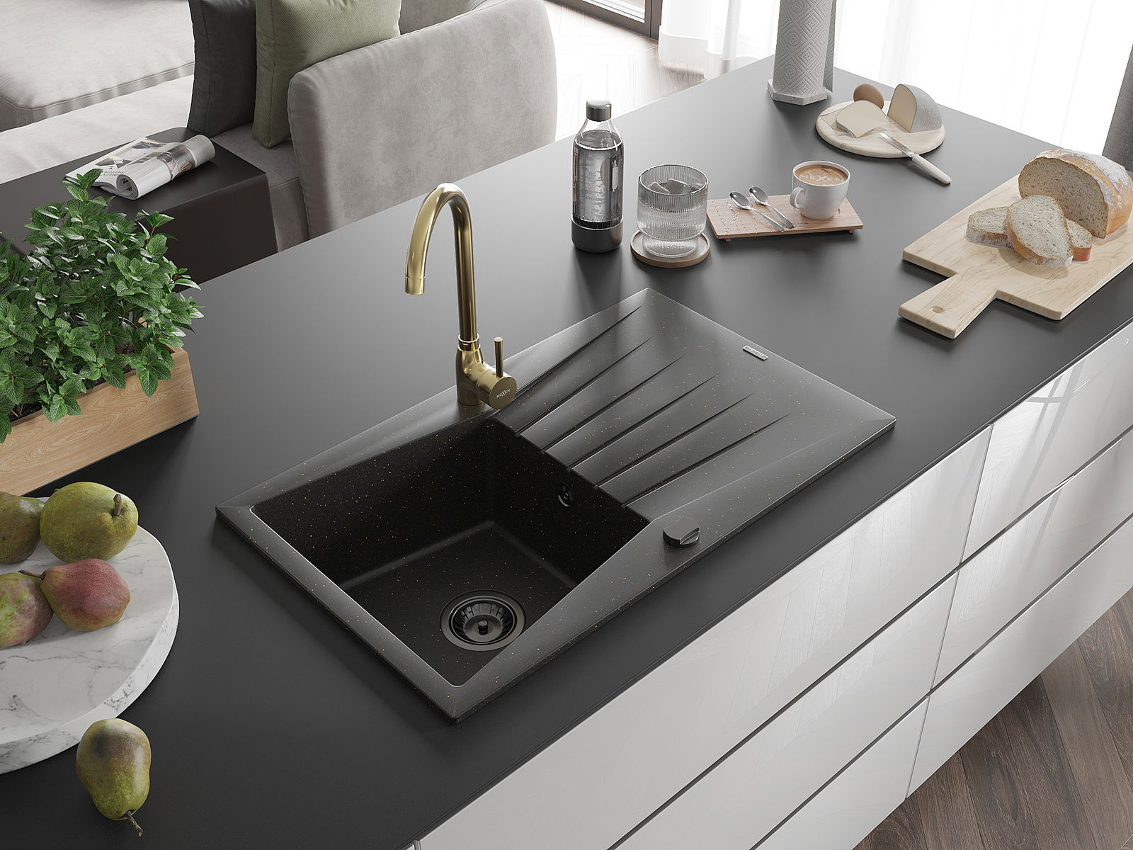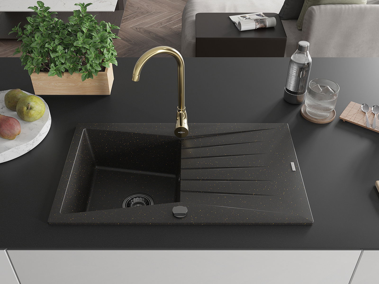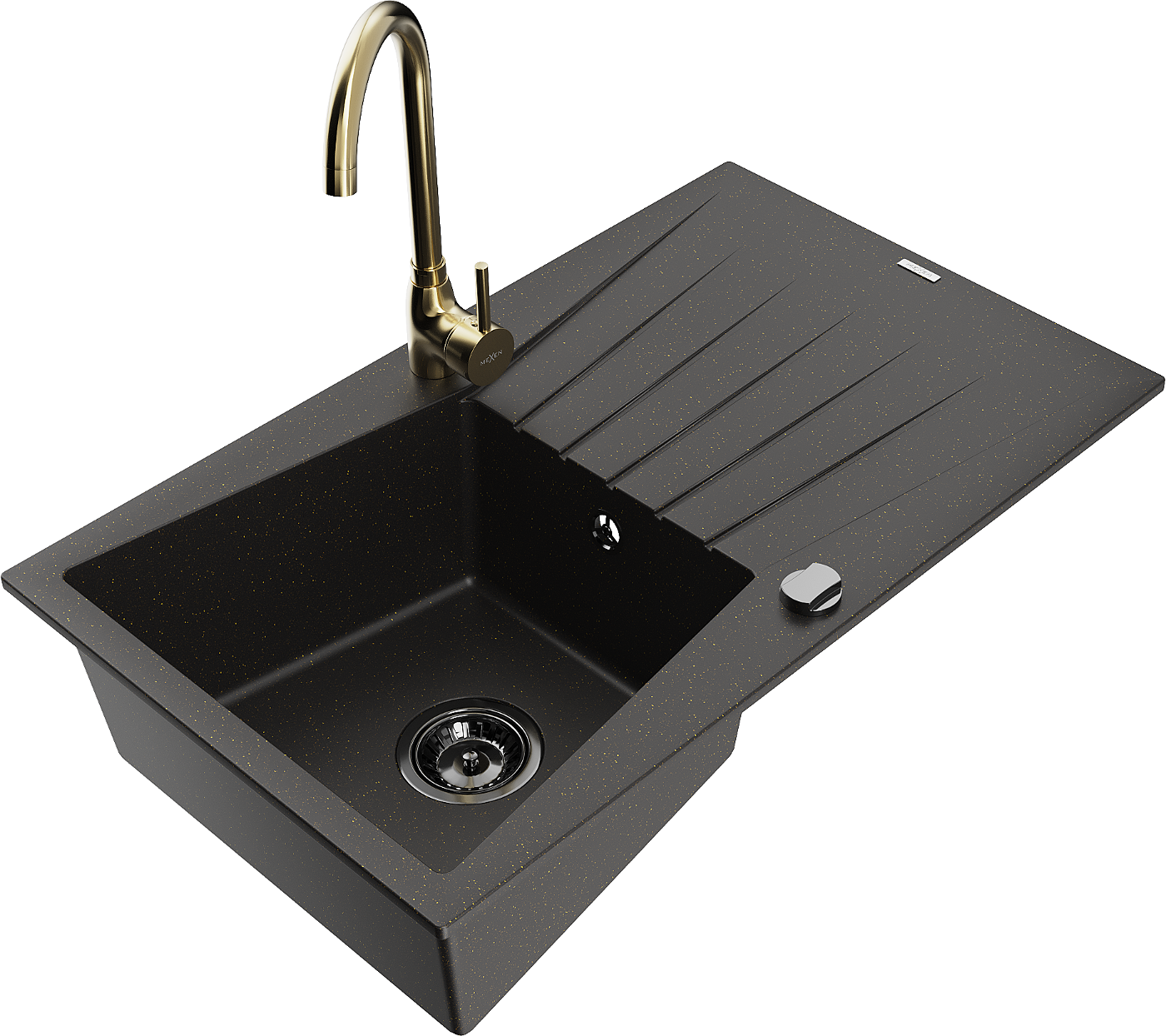 Mexen Cesar žulový kuchynský drez s 1 komorou a odkvapkávačom a kuchynská batéria Telma, čierna/zlatá - 6514-75-670200-50-B