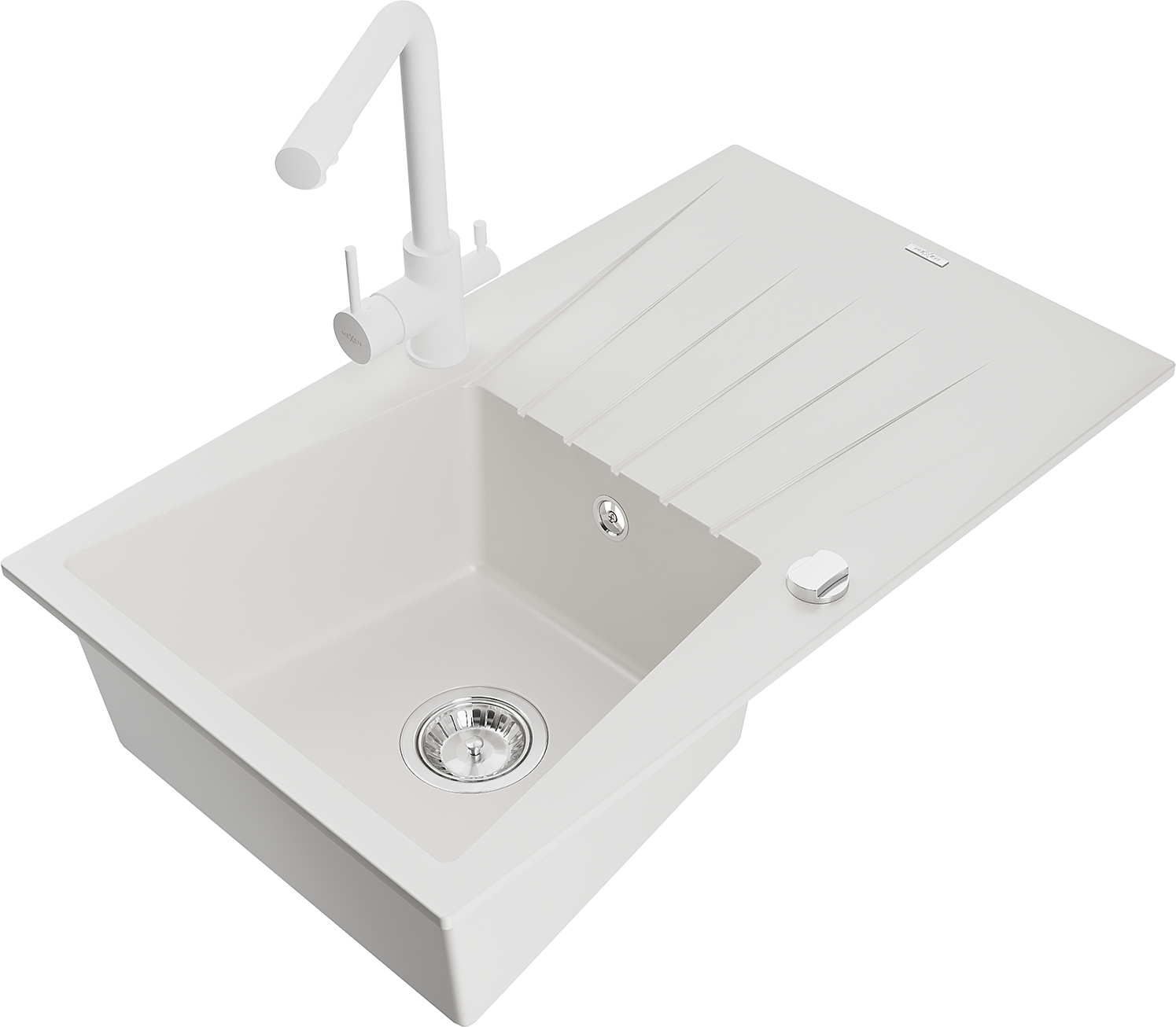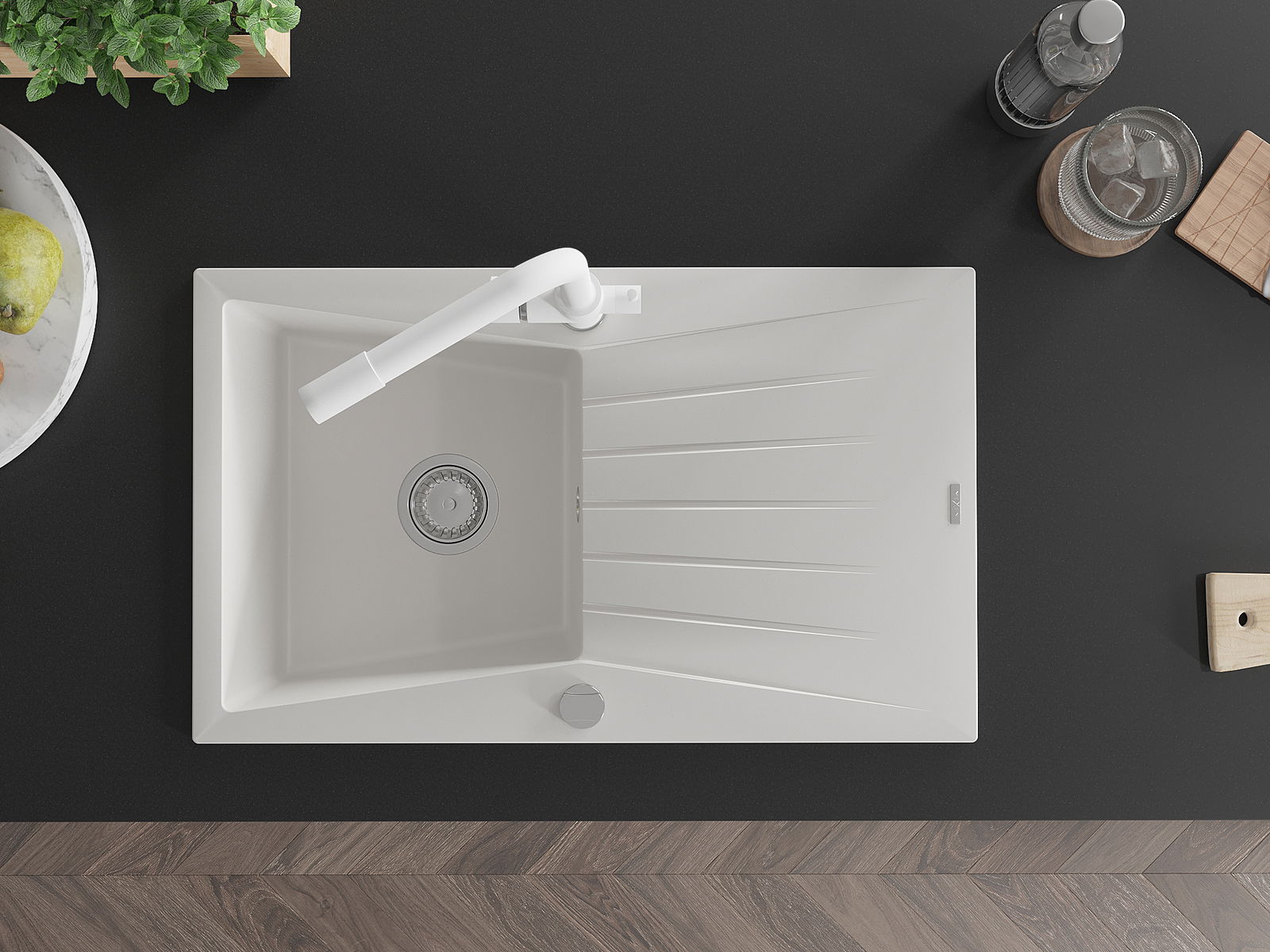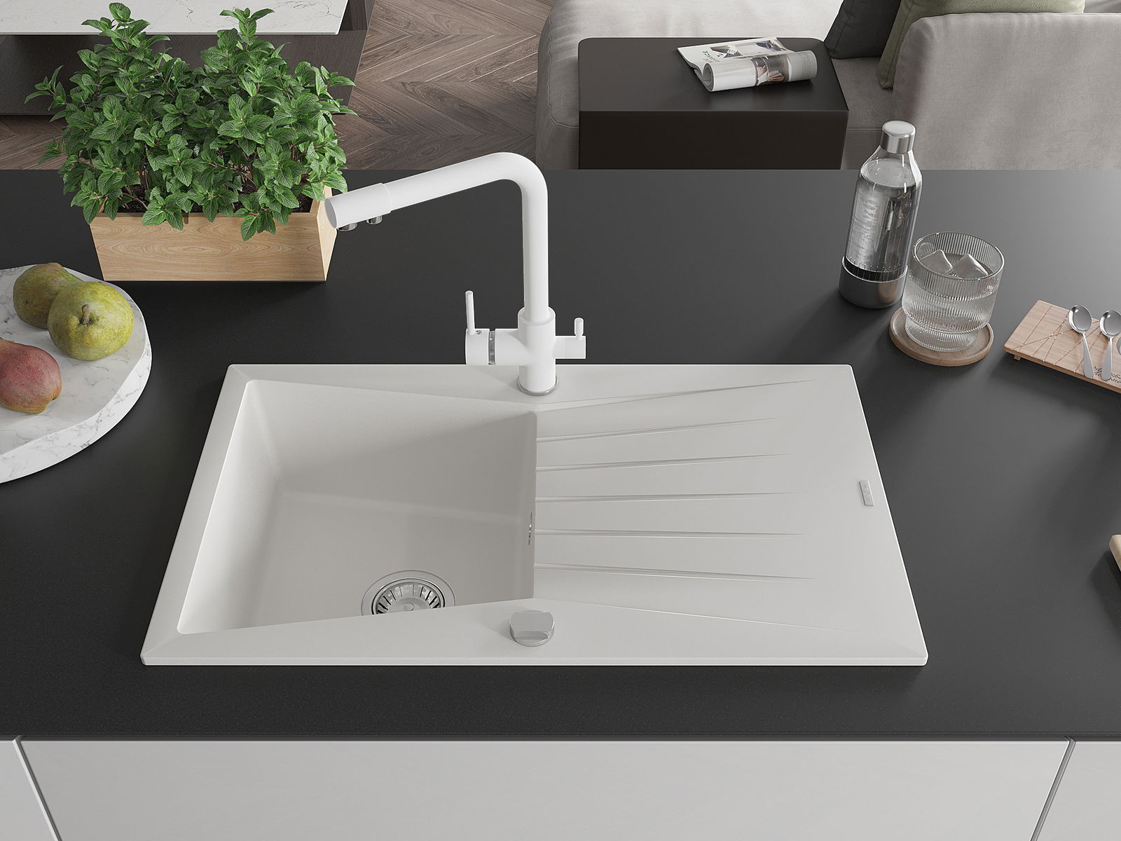Mexen Cesar žulový kuchynský drez s odkvapkávačom a kuchynskou batériou Duero, biely - 6514-20-671600-20
