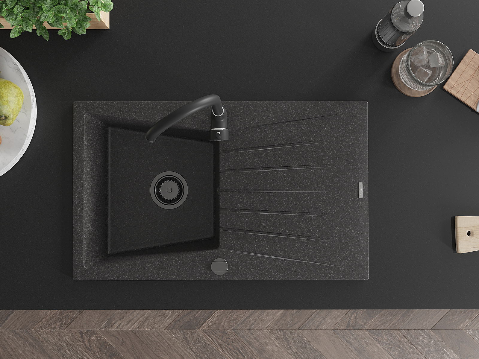 Povrch kuchynského drezu je odolný voči škvrnám a zafarbeniu, vďaka čomu sa ľahko udržiava a zachováva svoju farbu počas dlhého obdobia používania. Estetický a praktický doplnok pre každú kuchyňu.