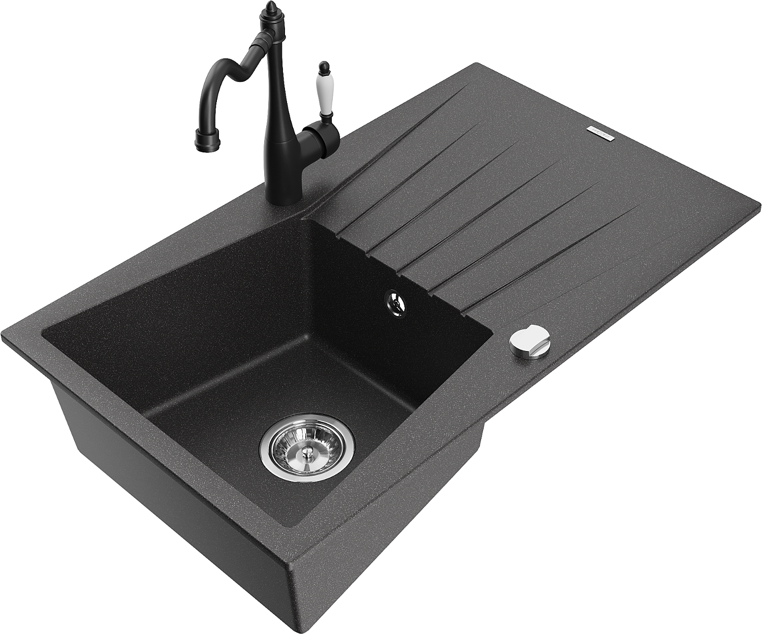 Mexen Cesar jednokomorový žulový drez s odkvapkávačom a kuchynskou batériou Carla, čierny škvrnitý - 6514-76-670700-70