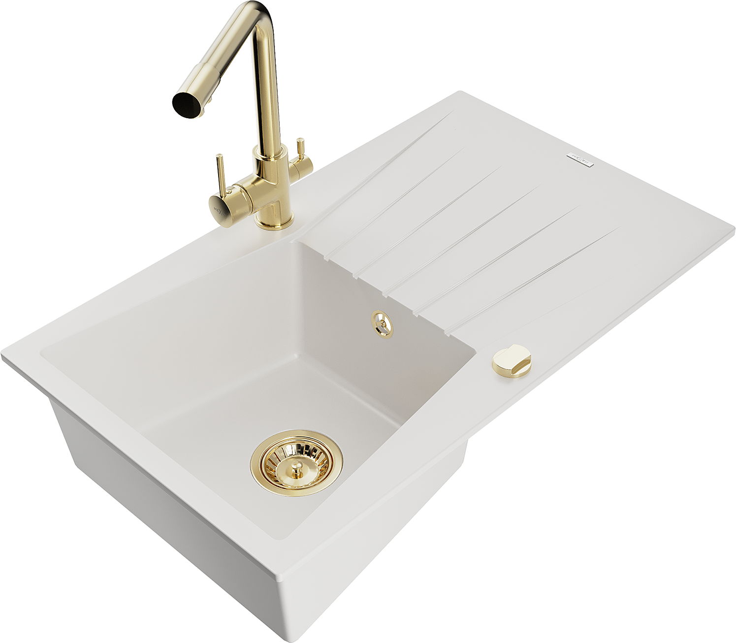 Mexen Cesar žulový kuchynský drez s 1 komorou a odkvapkávačom a kuchynská batéria Duero, biela - 6514-20-671600-50