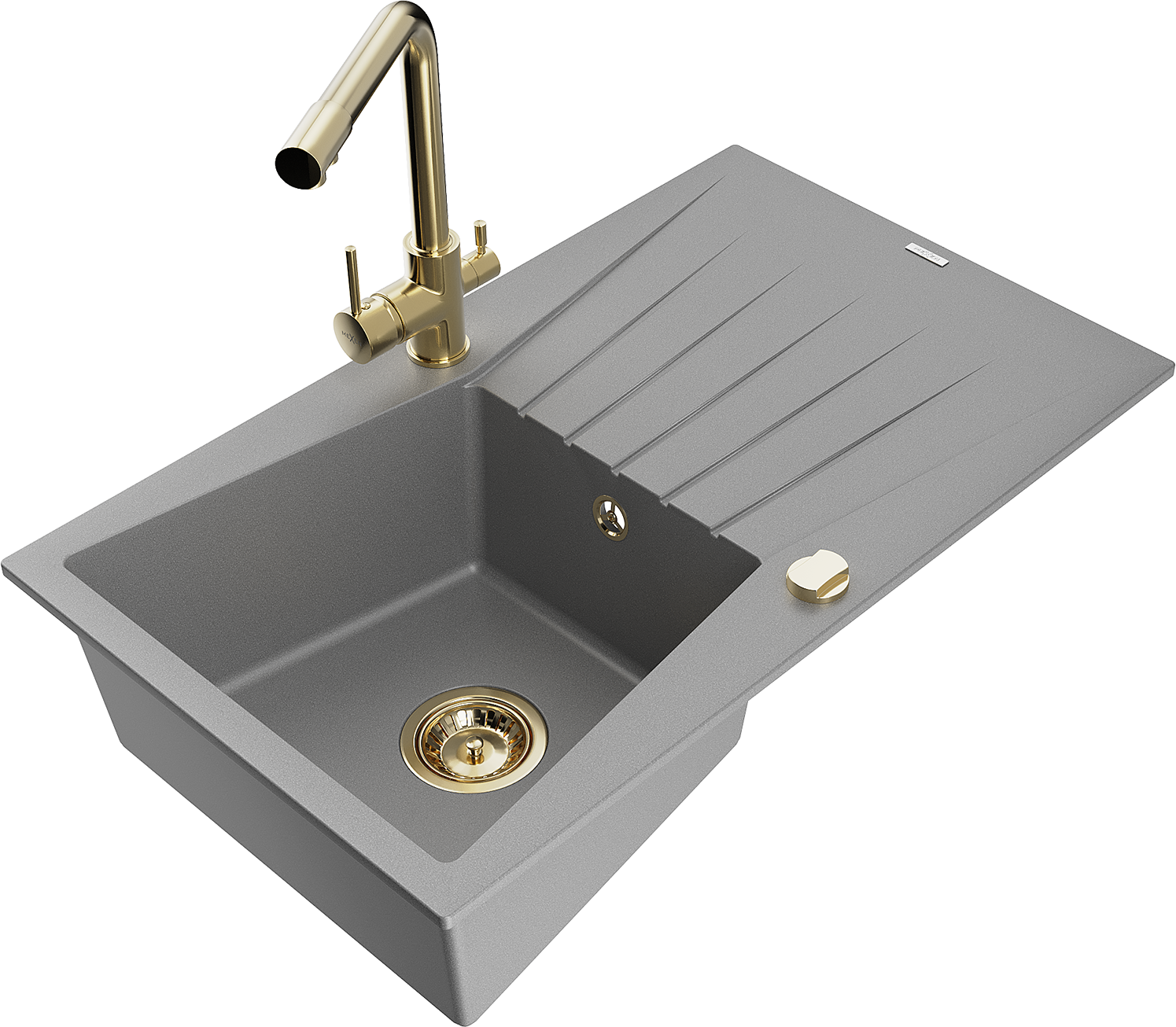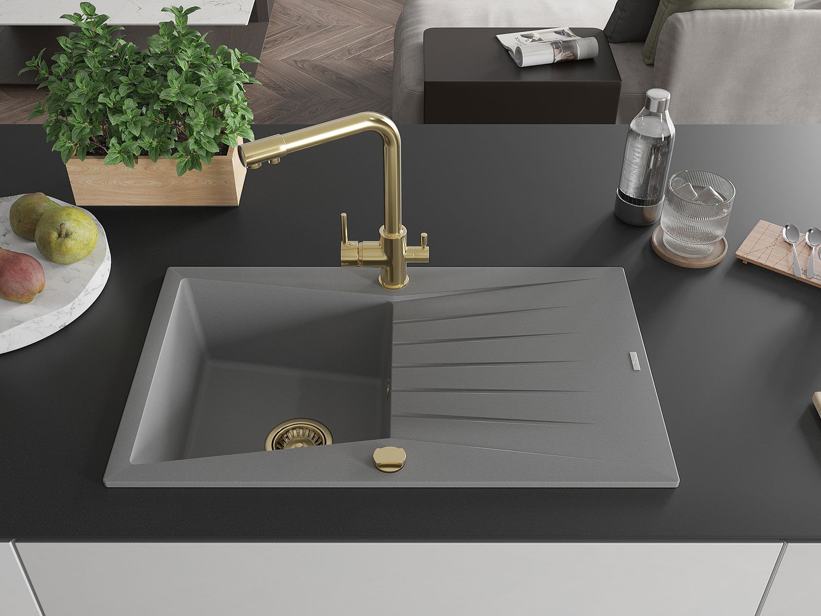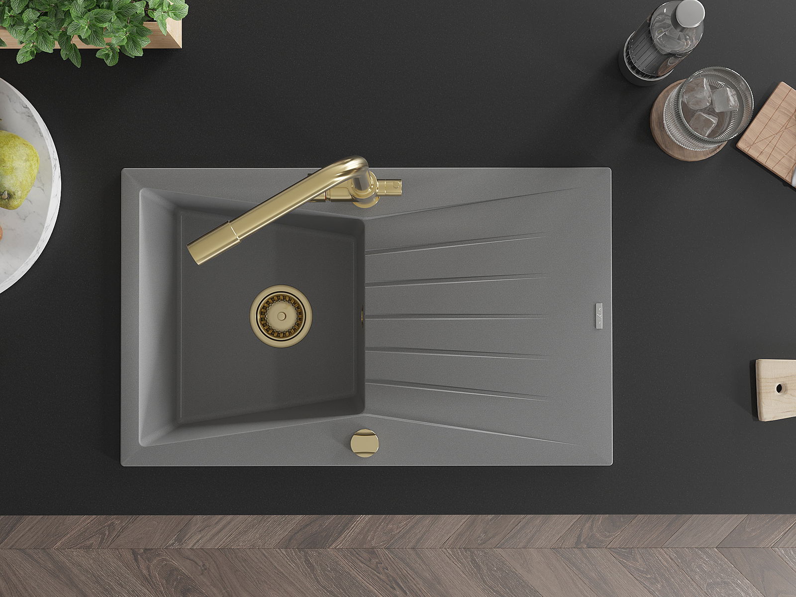 Mexen Cesar žulový drez 1-komorový s odkvapkávačom a kuchynskou batériou Duero, sivý - 6514-71-671600-50