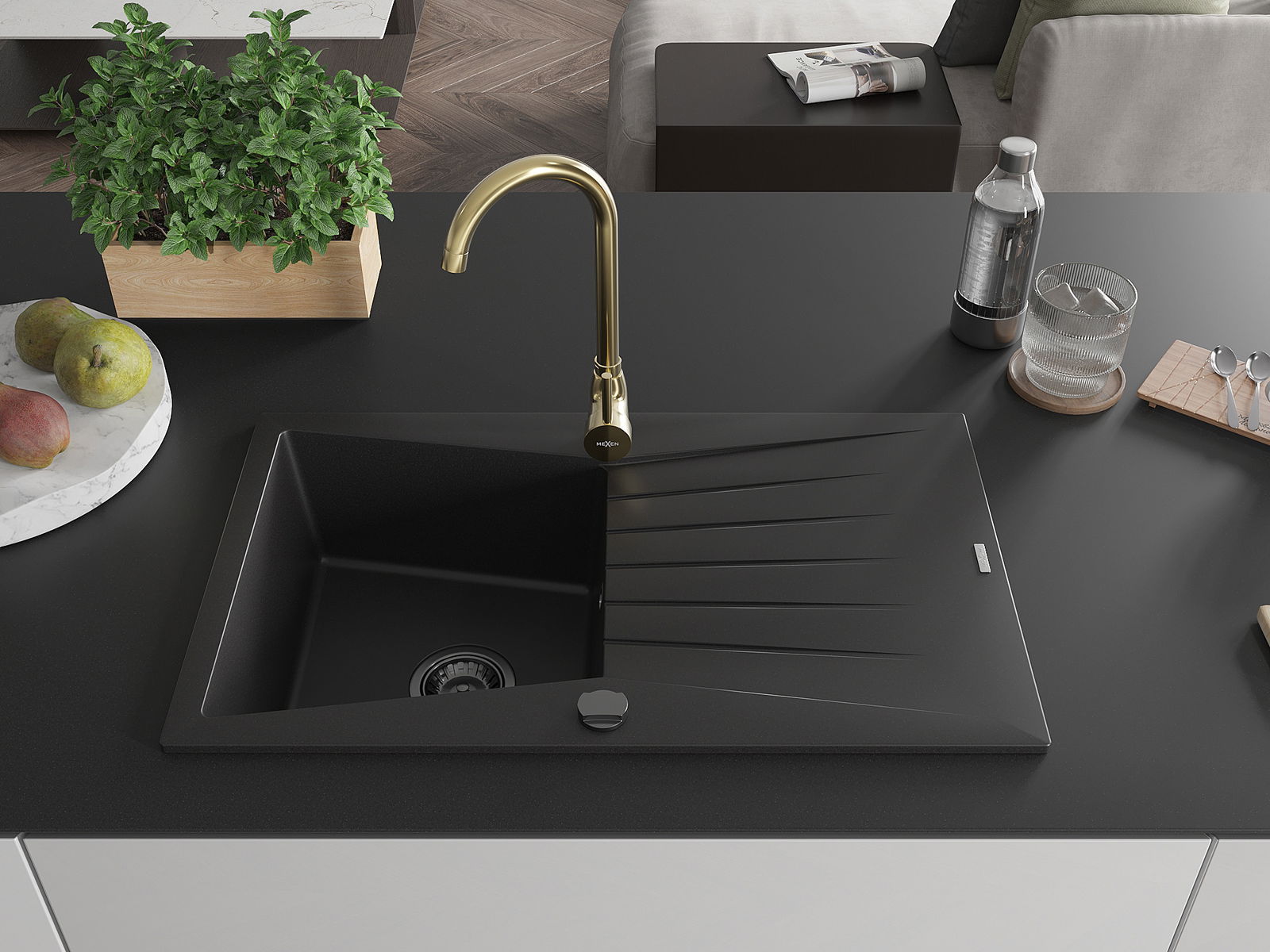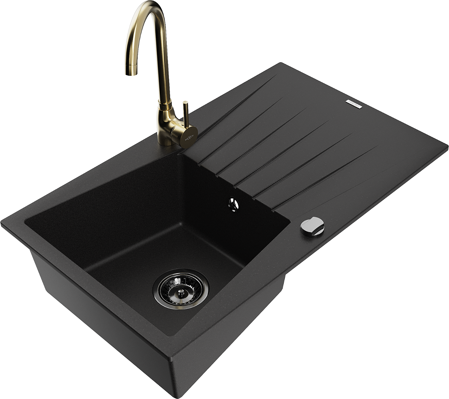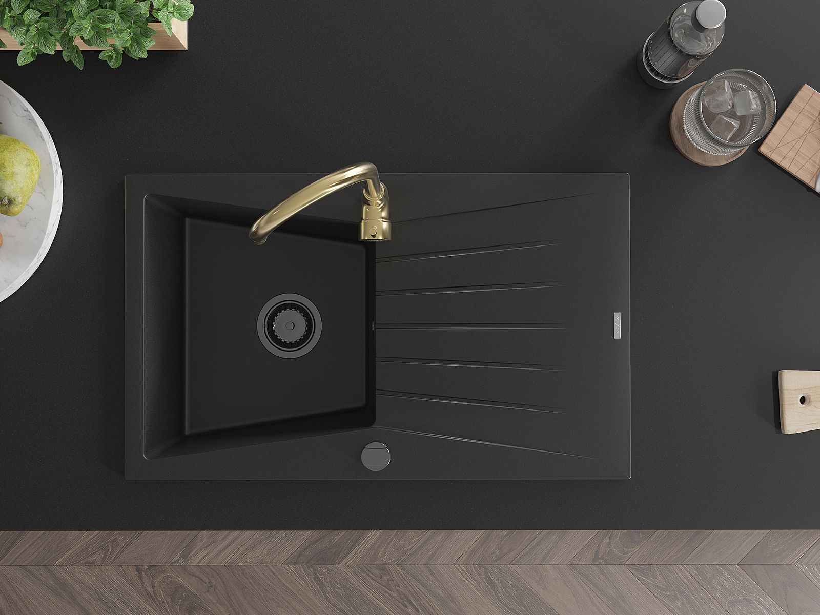 Mexen Cesar granitový drez s 1 komorou a odkvapkávačom a kuchynskou batériou Telma, čierny - 6514-77-670200-50-B