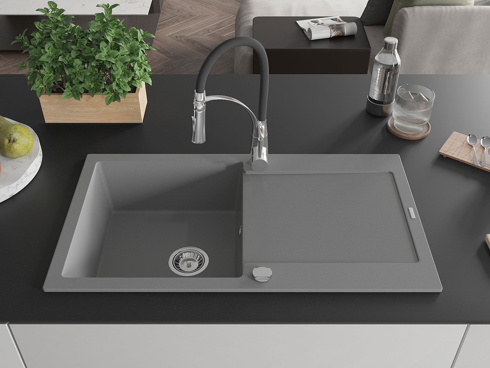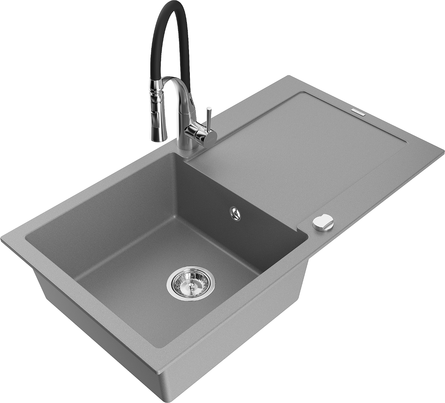 Mexen Leo granitový drez 1-komorový s odkvapkávačom a kuchynskou batériou Aster, sivá - 6501-71-73450-07