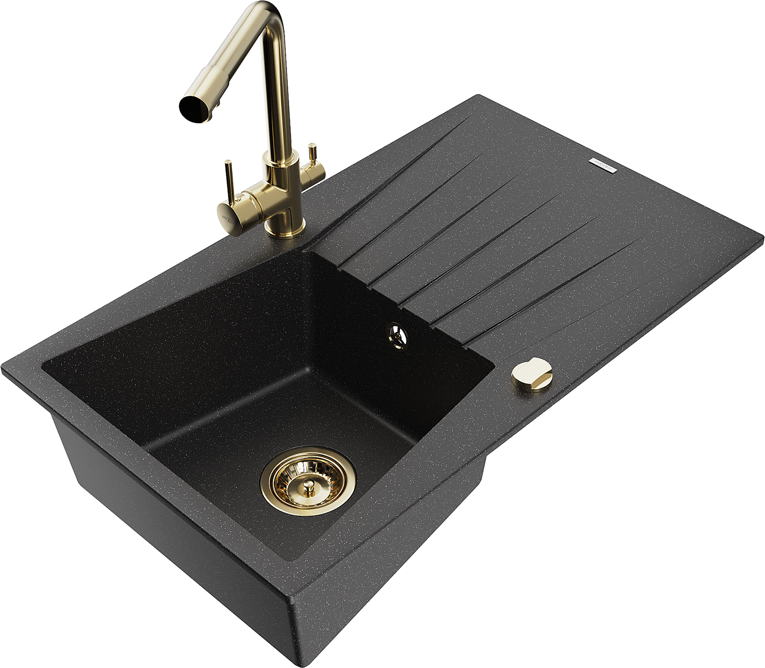 Mexen Cesar granitový drez s 1-komorou s odkvapkávačom a kuchynskou batériou Duero, čierny/strieborný metalik