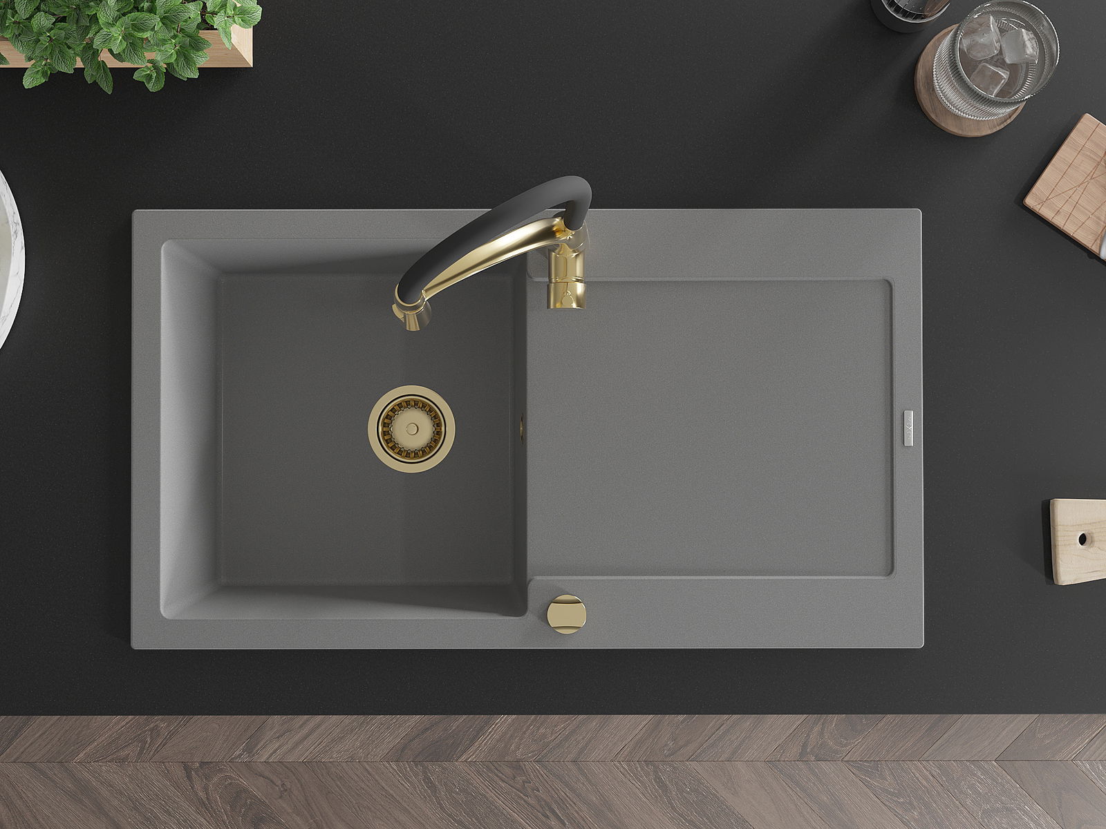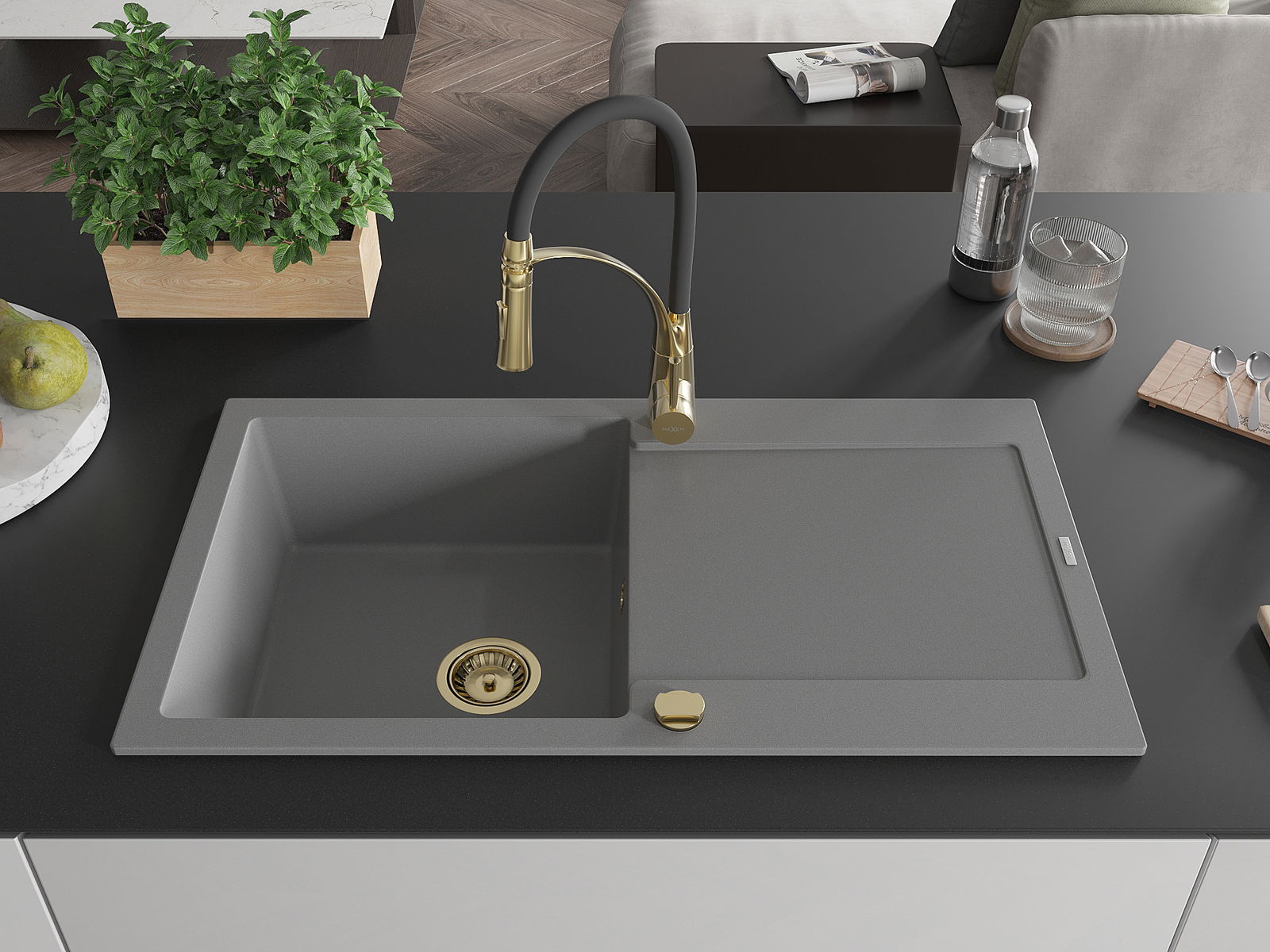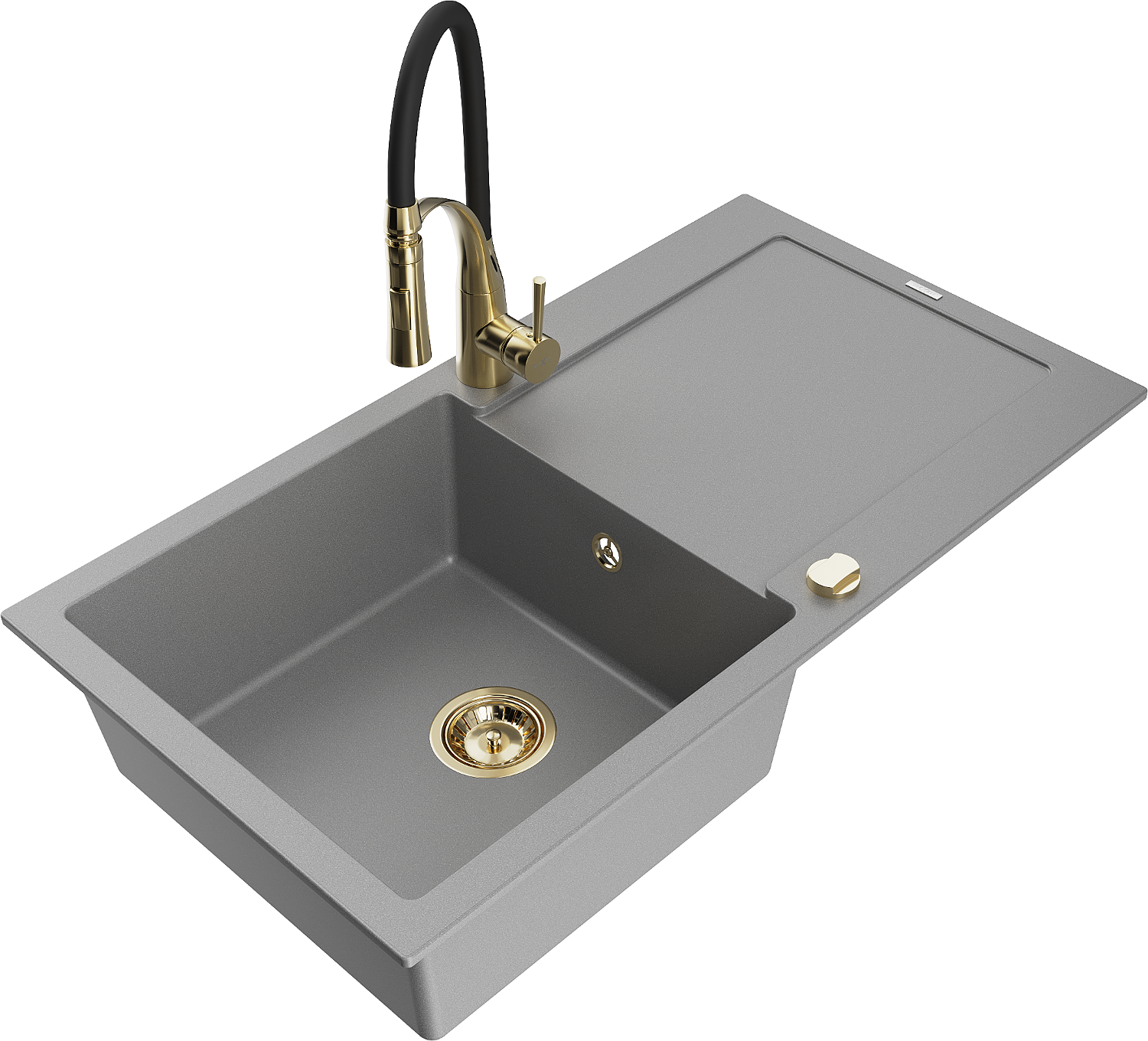 Mexen Leo žulový kuchynský drez 1-komorový s odkvapkávačom a kuchynskou batériou Aster, sivý - 6501-71-73450-57-G