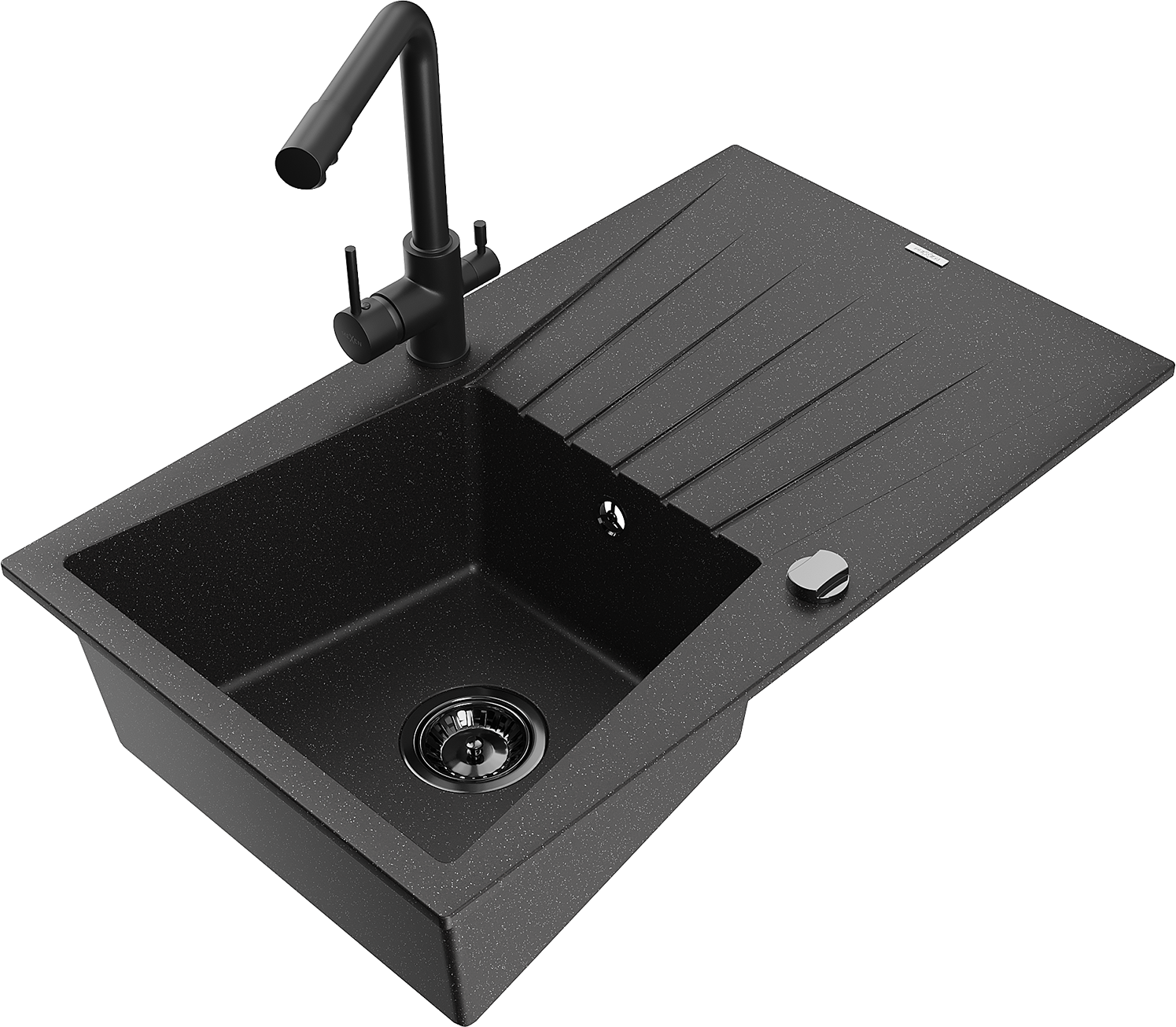 Mexen Cesar granitový drez s 1 komorou s odkvapkávacou plochou a kuchynskou batériou Duero, čierny/strieborný metalický