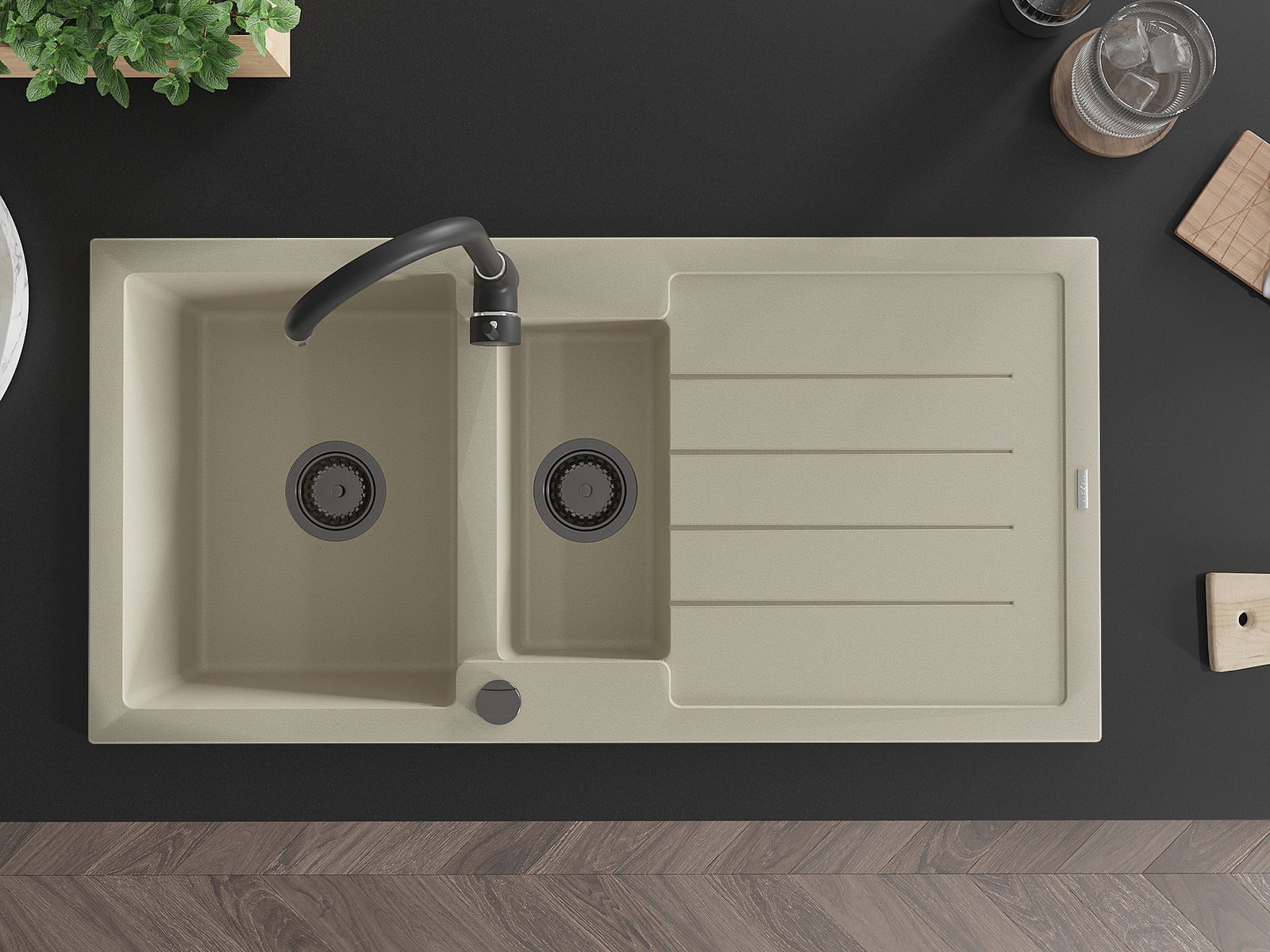 Mexen Andres žulový drez 1,5-komorový s odkvapkávačom a kuchynskou batériou Telma, béžový - 6515-69-670200-70