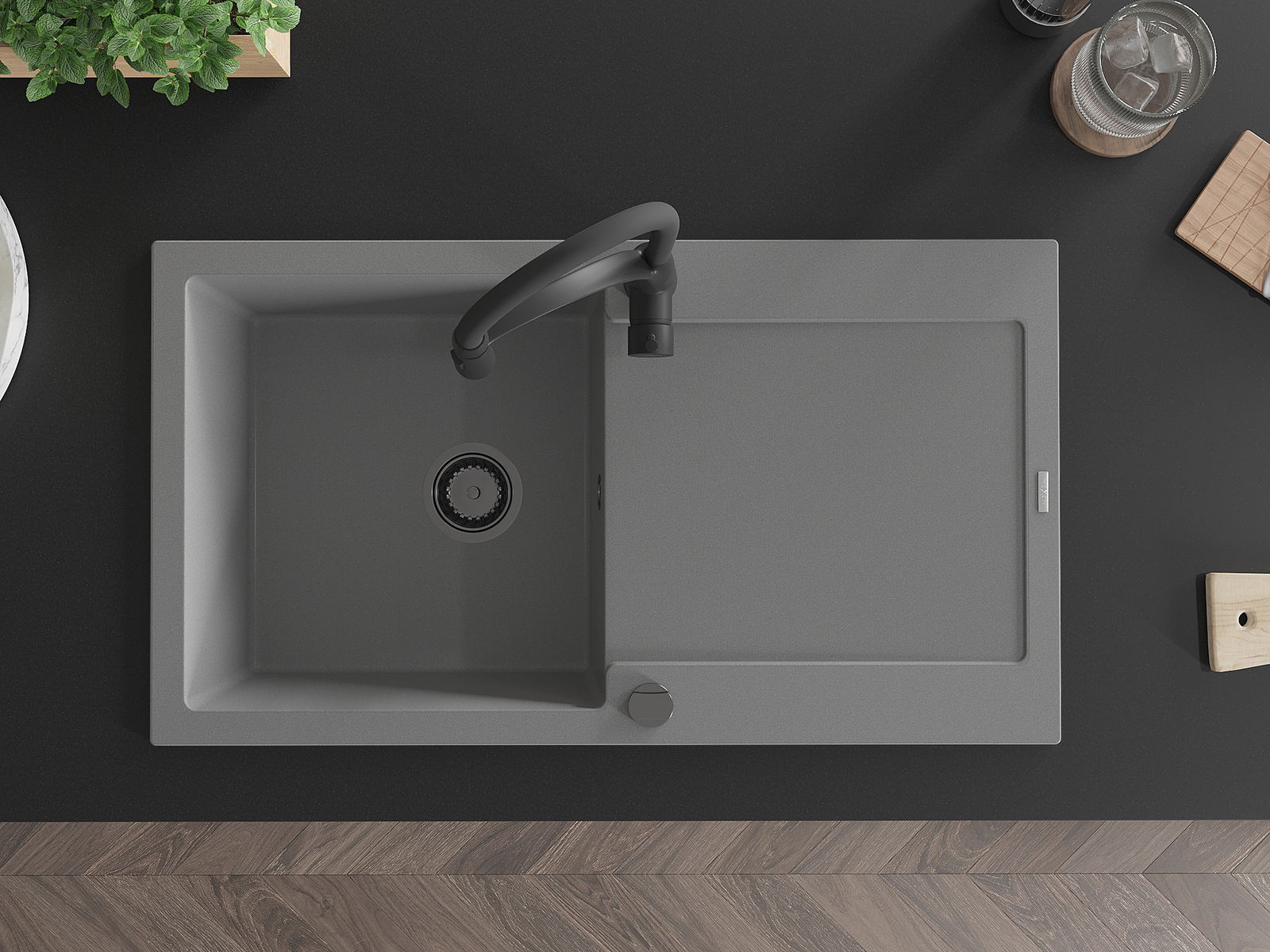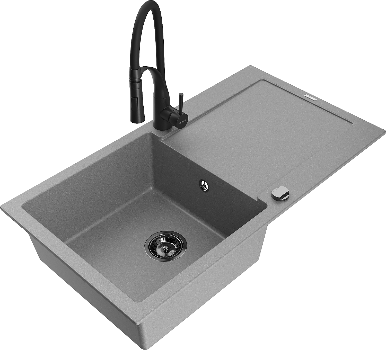 Mexen Leo žulový drez s 1 komorou a odkvapkávačom a kuchynská batéria Aster, sivá - 6501-71-73450-70-B