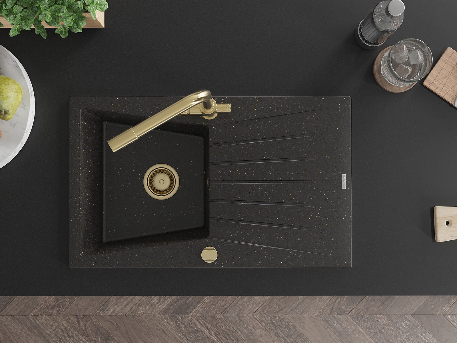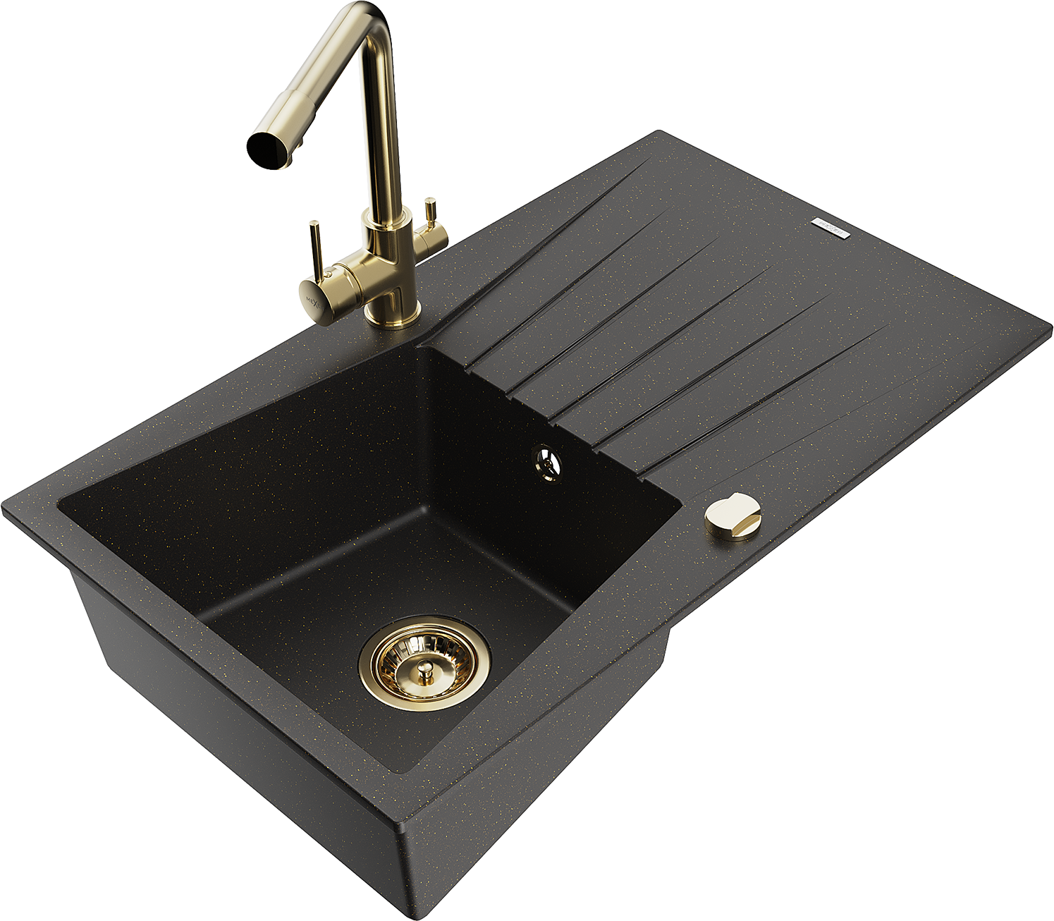 Mexen Cesar žulový drez s 1-komorou s odkvapkávačom a kuchynskou batériou Duero, čierny/zlatý metalik - 6514-75-671600-50