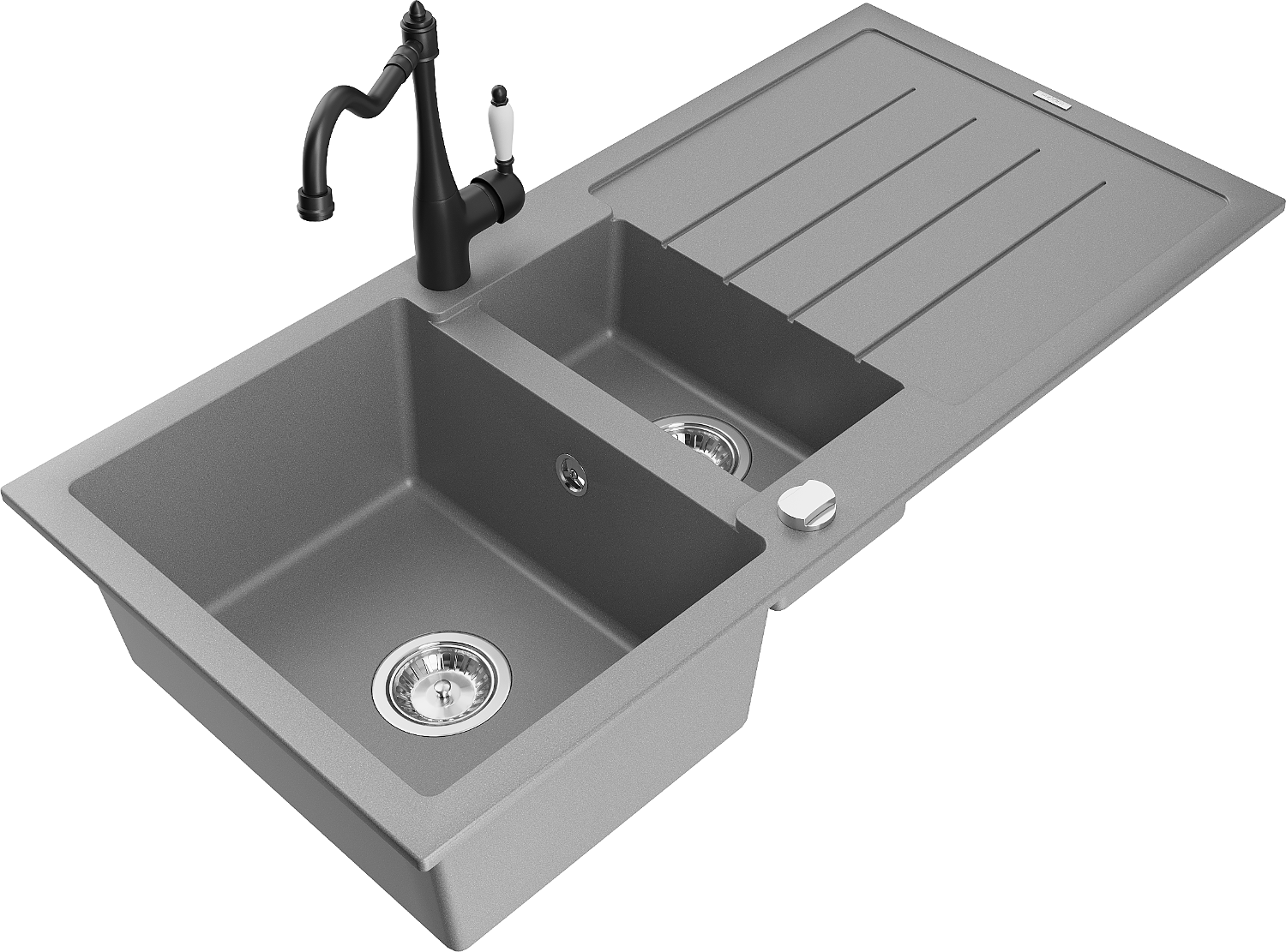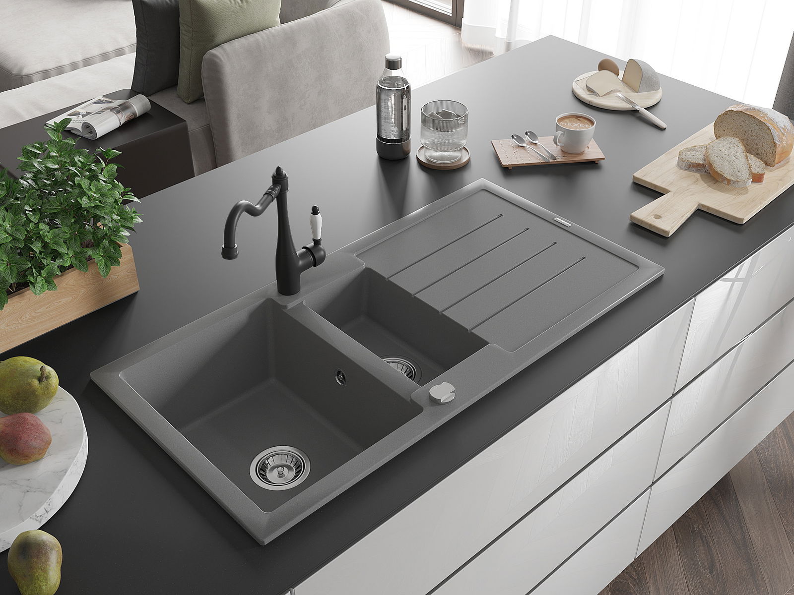 Mexen Andres žulový drez 1,5-komorový s odkvapkávacou plochou a kuchynskou batériou Carla, sivý - 6515-71-670700-70