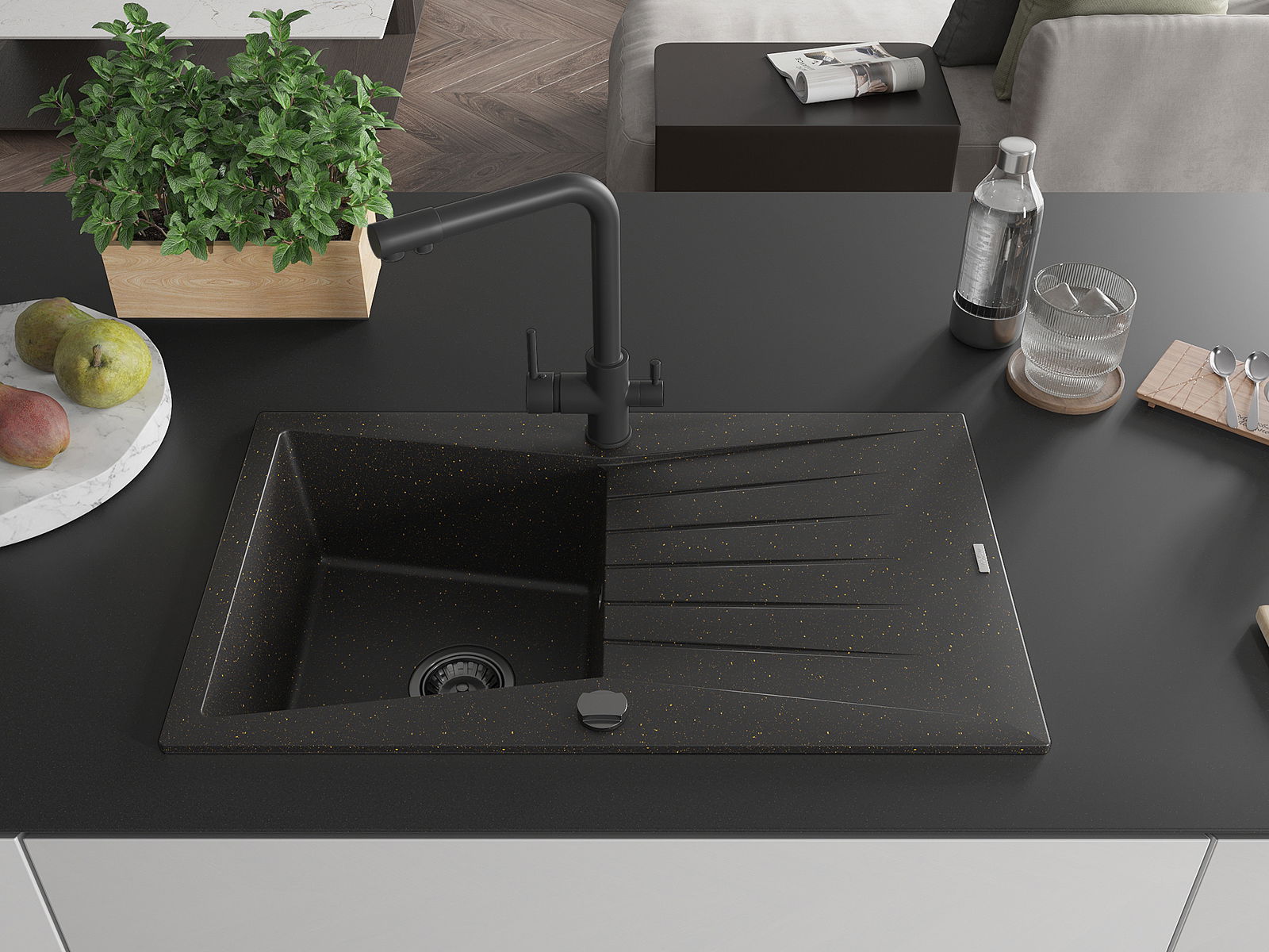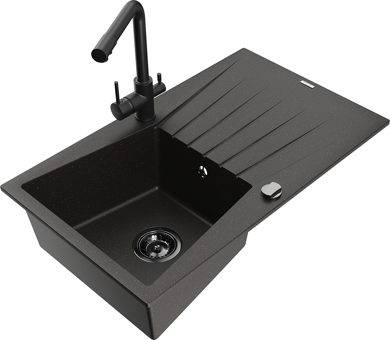 Mexen Cesar žulový drez s 1 komorou s odkvapkávačom a kuchynskou batériou Duero, čierny/zlatý metalický - 6514-75-671600-70-B