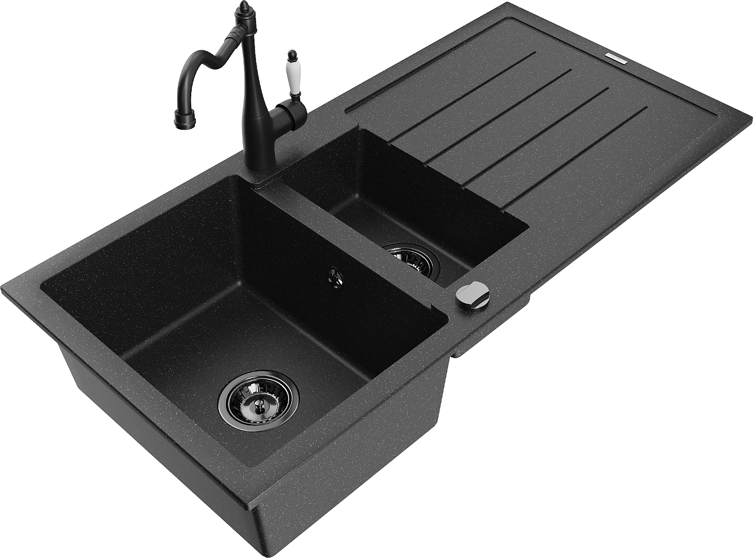 Mexen Andres žulový drez 1,5-komorový s odkvapkávačom a kuchynskou batériou Carla, čierny/strieborný - 6515-73-670700-70-B