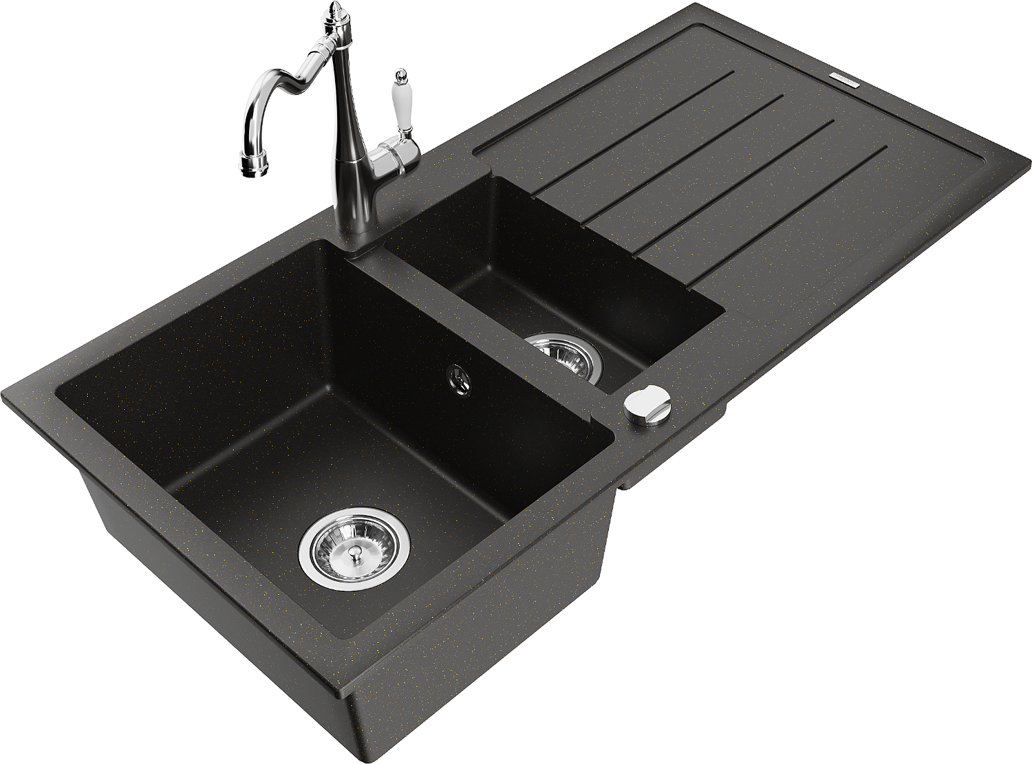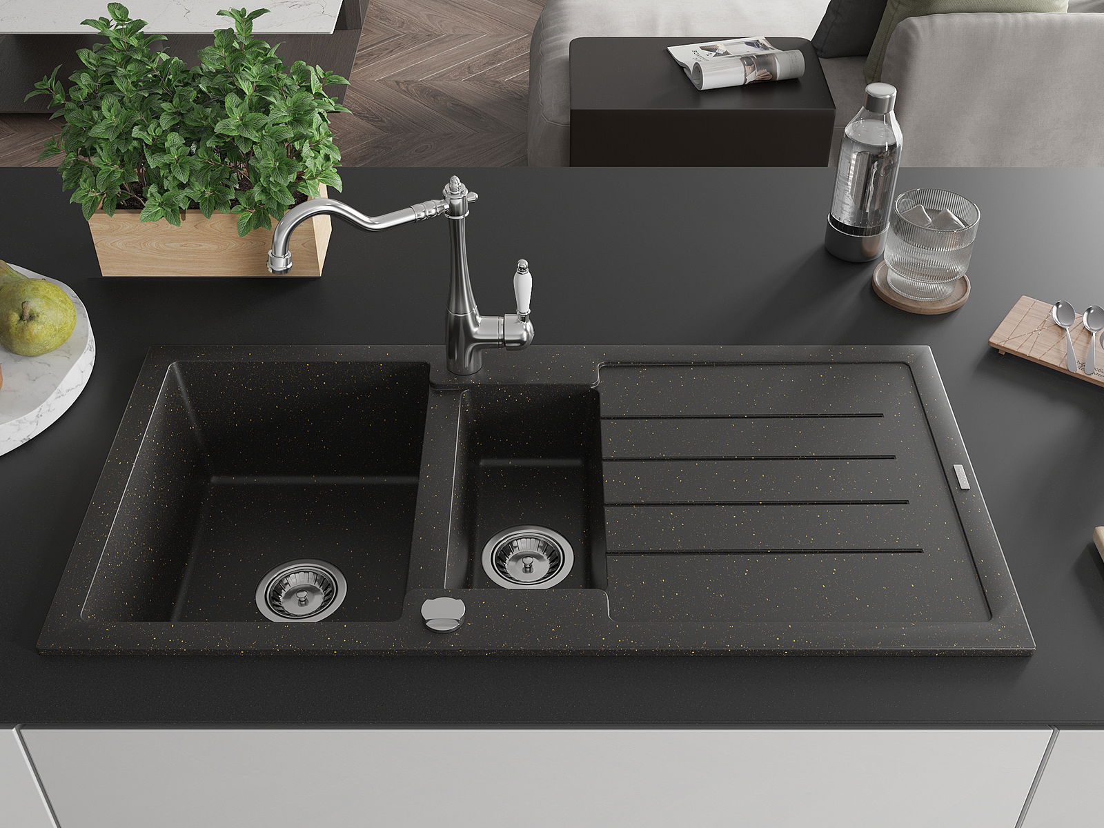 Mexen Andres žulový drez 1,5-komorový s odkvapkávačom a kuchynskou batériou Carla, čierny/zlatý metalik - 6515-75-670700-00
