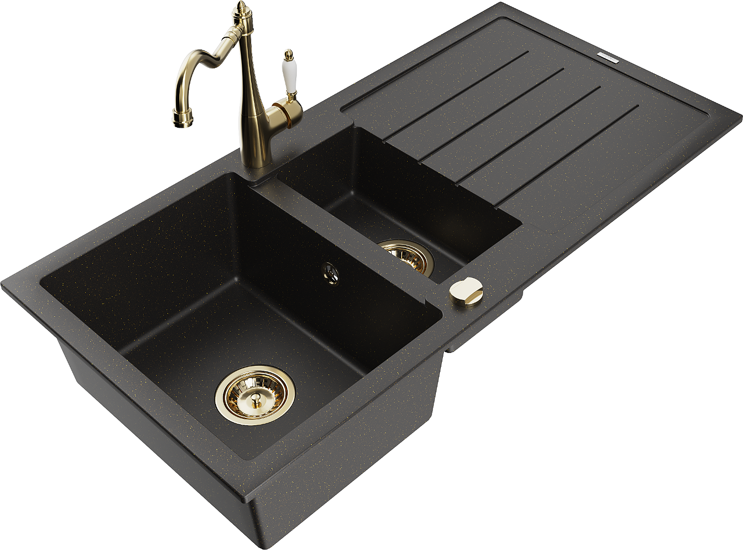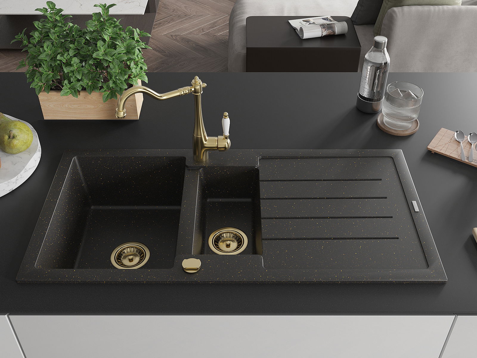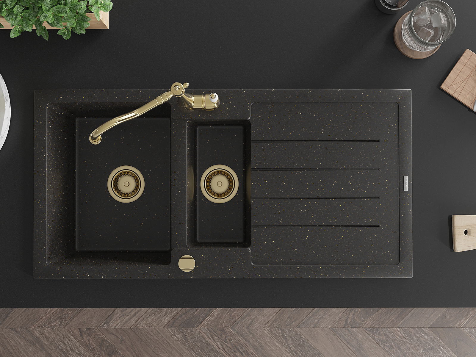Mexen Andres granitový drez 1,5-komorový s odkvapkávačom a kuchynskou batériou Carla, čierny/zlatý metalik - 6515-75-670700-50