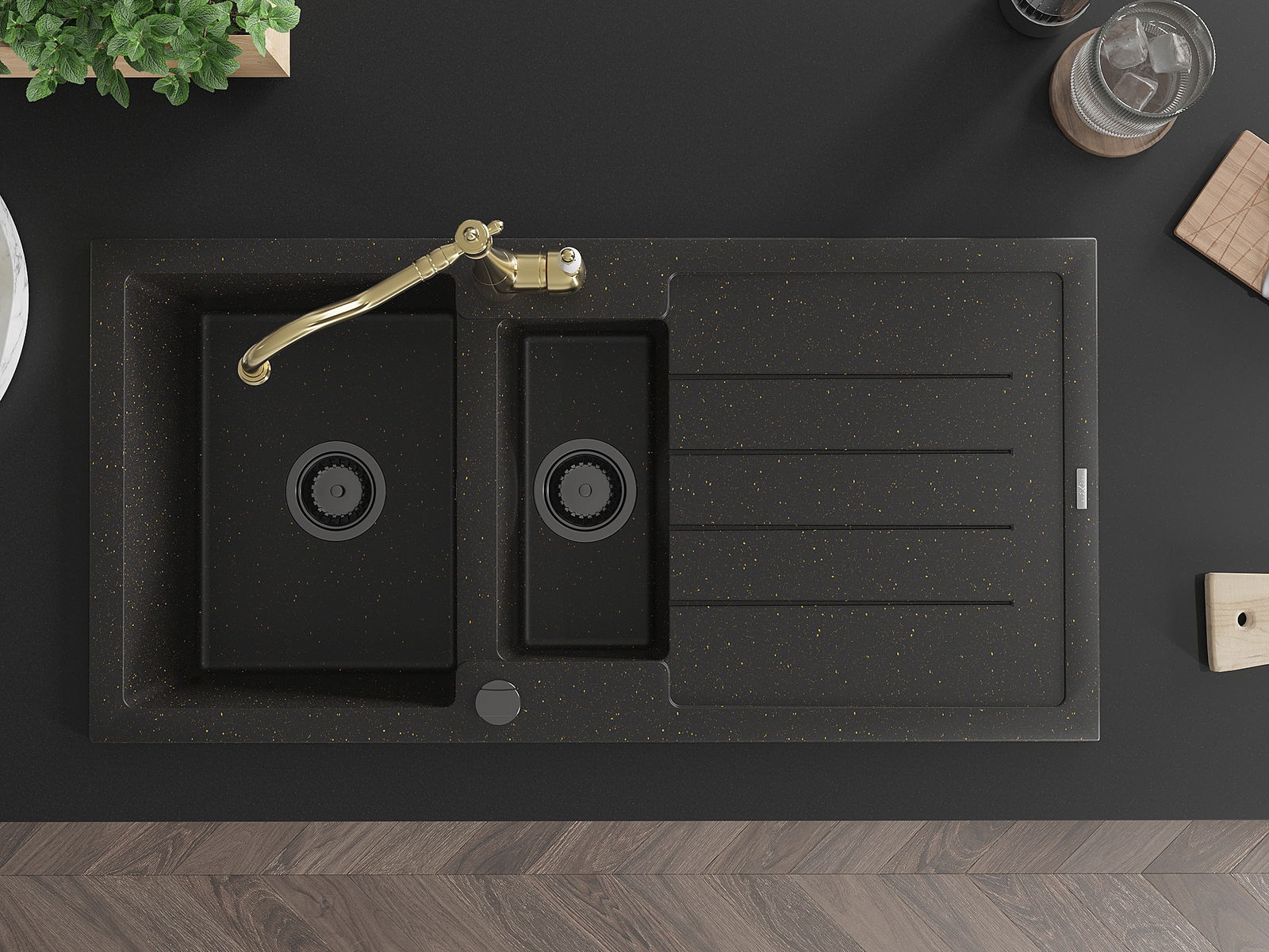 Mexen Andres granitový drez 1,5-komorový s odkvapkávačom a kuchynskou batériou Carla, čierny/zlatý - 6515-75-670700-50-B