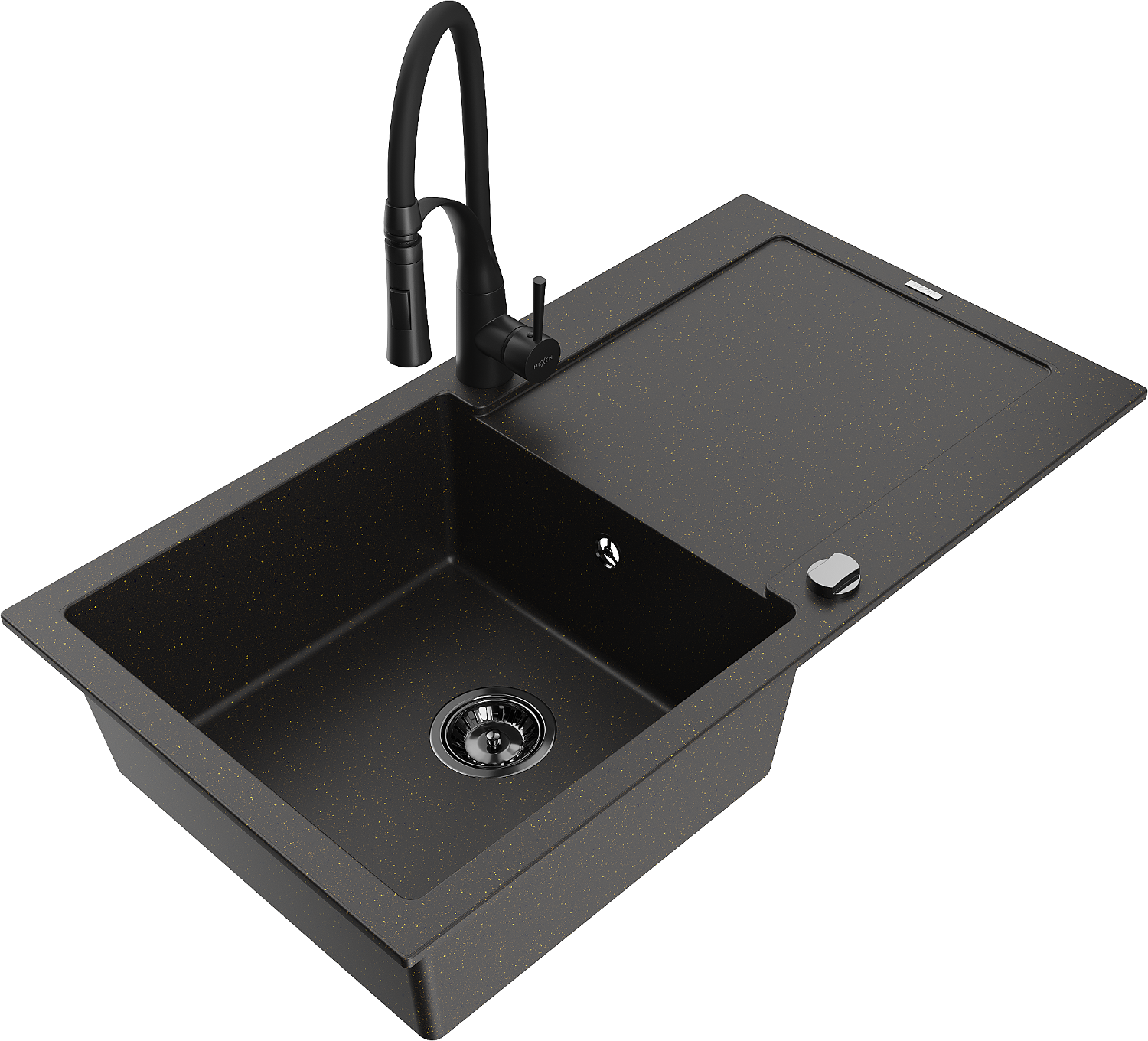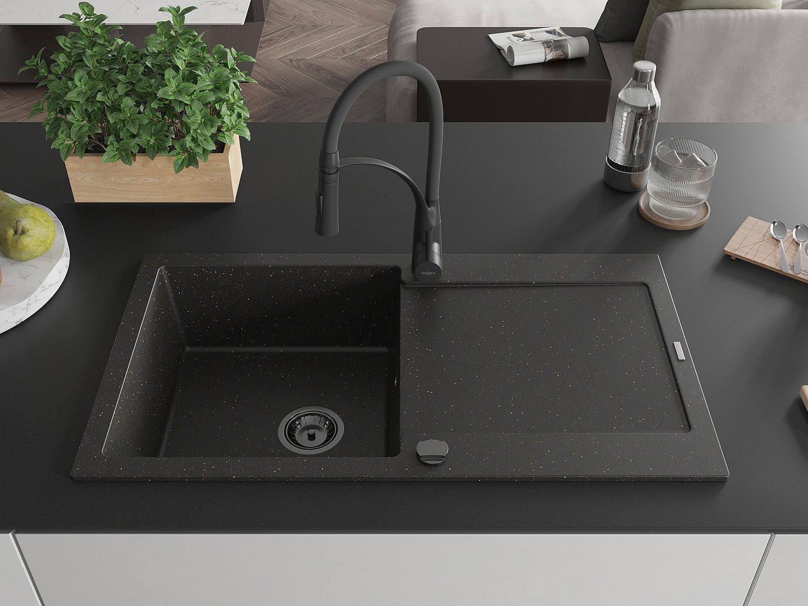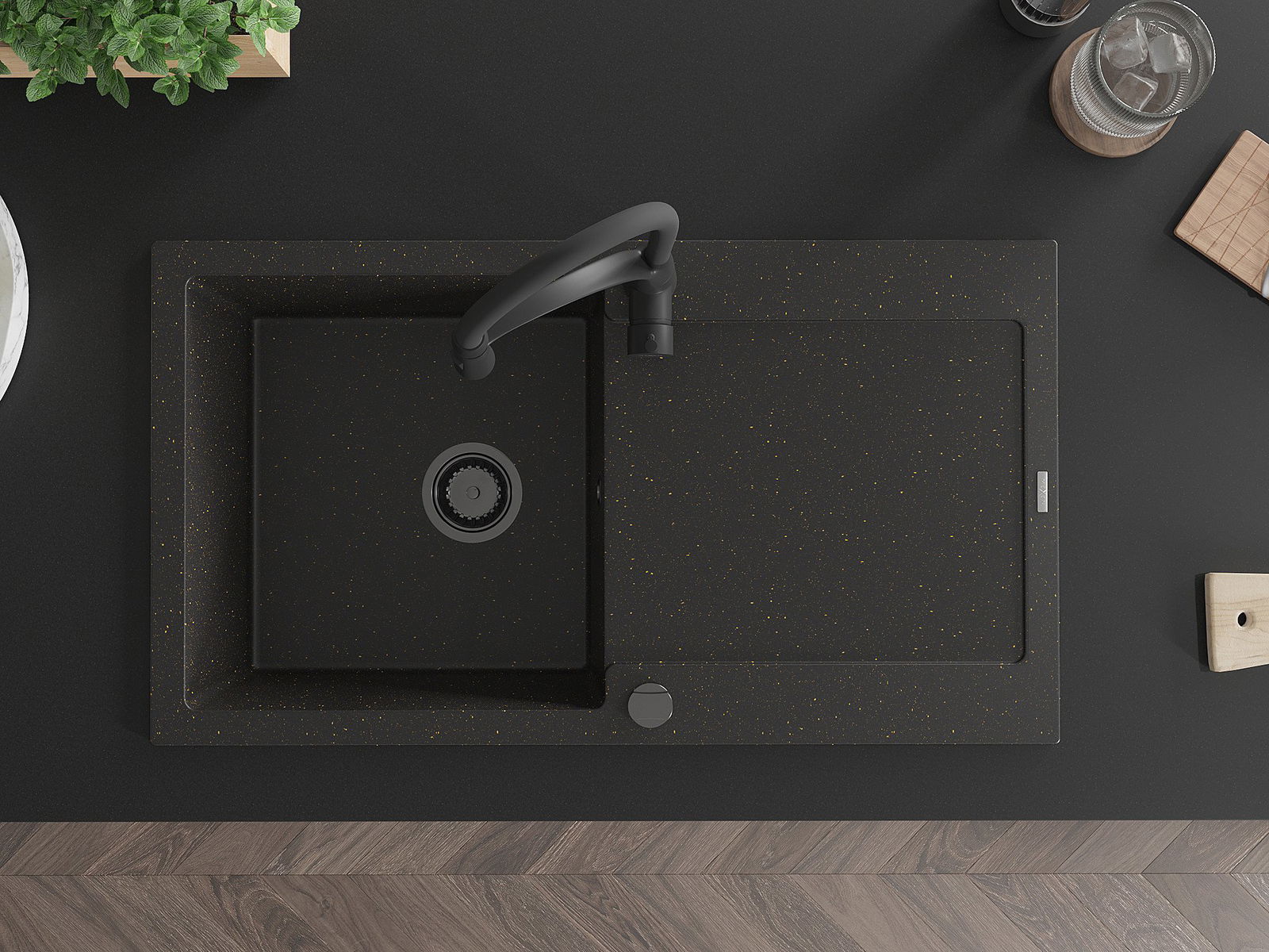 Mexen Leo granitový jednokomorový drez s odkvapkávačom a kuchynskou batériou Aster, čierny/zlatý metalik