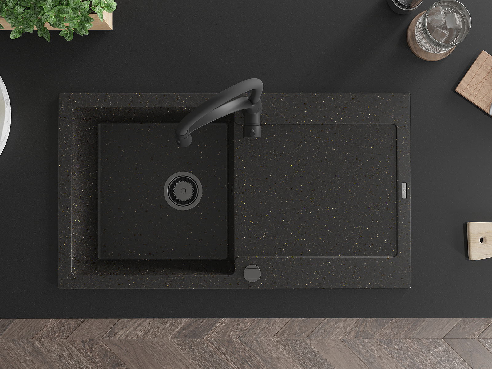 Mexen Leo žulový kuchynský drez 1-komorový s odkvapkávačom a kuchynskou batériou Aster, čierny/zlatý metalik - 6501-75-73450-70?